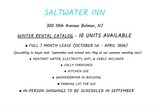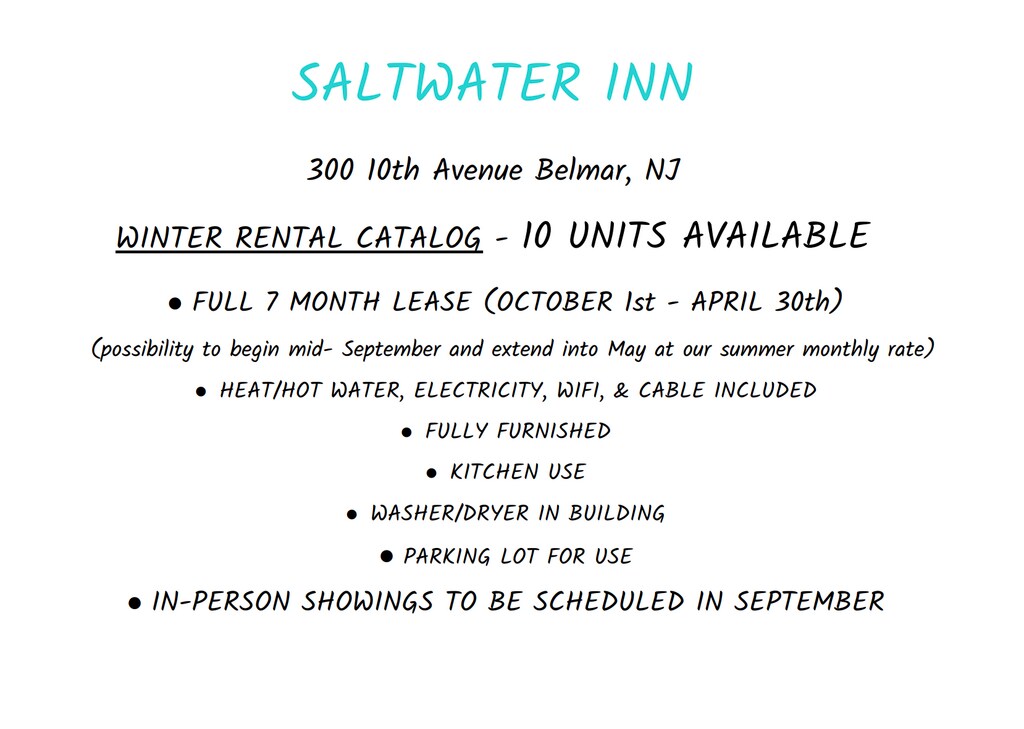 Ahora aceptamos solicitudes para arrendatarios de alquiler de invierno (del 1 de octubre al 30 de abril). Los alquileres se encuentran en SaltWater Inn en Belmar, NJ (300 10th Ave). Queda una unidad: es una opción de cuatro dormitorios que incluye una sala de estar y un baño y medio. Los arrendatarios tendrán acceso a una cocina compartida ubicada en el primer piso. La lavadora/secadora operada por monedas ubicada en el tercer piso del edificio. Estacionamiento en la parte trasera. El alquiler mensual incluye: cable, wifi, aire/calor central, agua caliente, electricidad. Sin cargos adicionales. Las presentaciones ahora están disponibles según la disponibilidad y las solicitudes. Políticas de inquilinos: -Saltwater Inn solo permite inquilinos registrados en las instalaciones. -La verificación de antecedentes/crédito se realizará tras la solicitud a cargo del solicitante. -No suministramos sábanas, ropa de cama, toallas, artículos de tocador ni alimentos. Los inquilinos deben traer lo necesario durante toda su estadía. -NO HAY PARTIDOS/MÚSICA EN MÚSICA (el tiempo de silencio en el INN es después de las 22:00). -No se permiten drogas/fumar dentro/dentro/alrededor del hotel. - No se permiten mascotas.