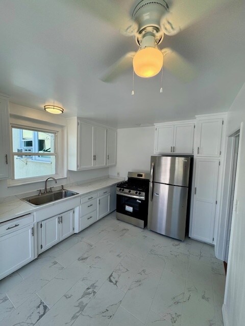 Beautiful duplex that has been totally renovated. Freshly painted with new appliances, quartz countertops, hardwood floors in living room and bedrooms, new tile in the kitchen and bathroom. Washer and Dryer hookup in unit. Parking available on the driveway and shared two car garage for storage. Nice front yard in a quiet and safe neighborhood. First month rent and deposit due at signing. Tenant pays for gas, electricity and trash. Tenant may use 1/2 of a two-car garage. Parking is on driveway in front of the garage or on the street. Owner pays for water and the gardener.