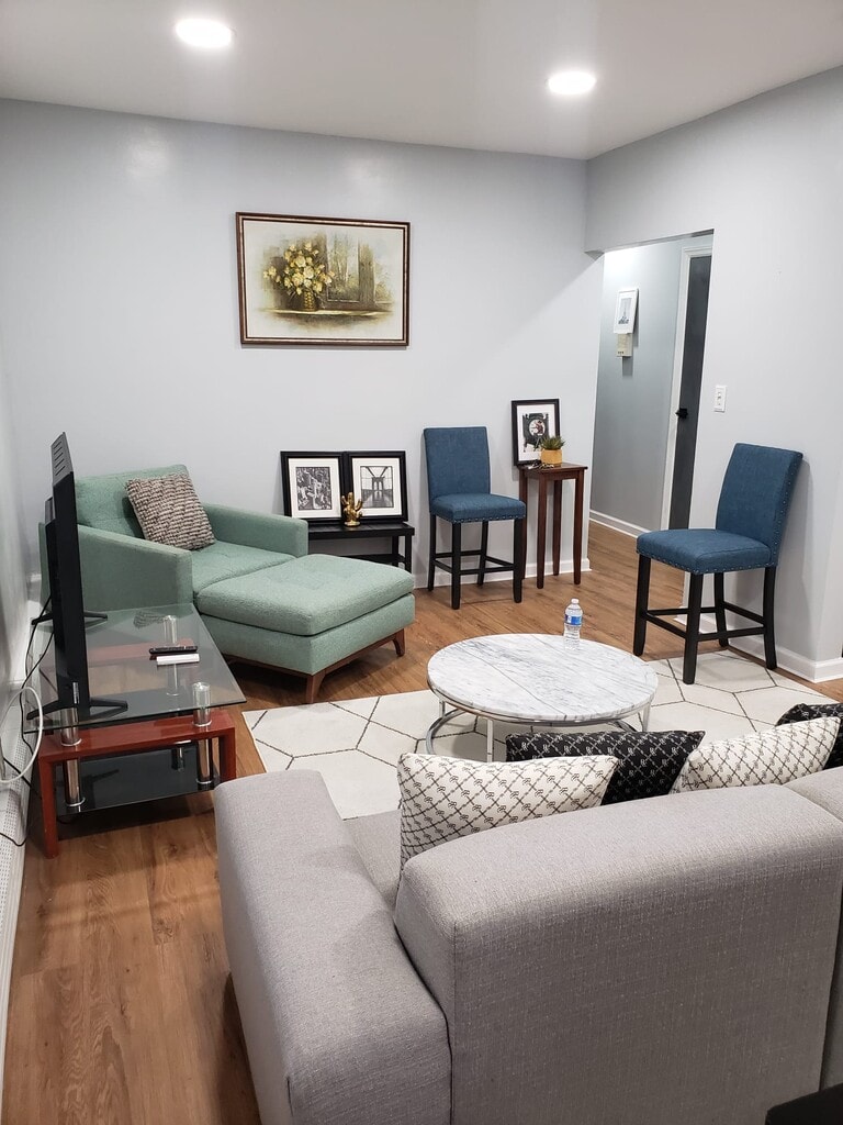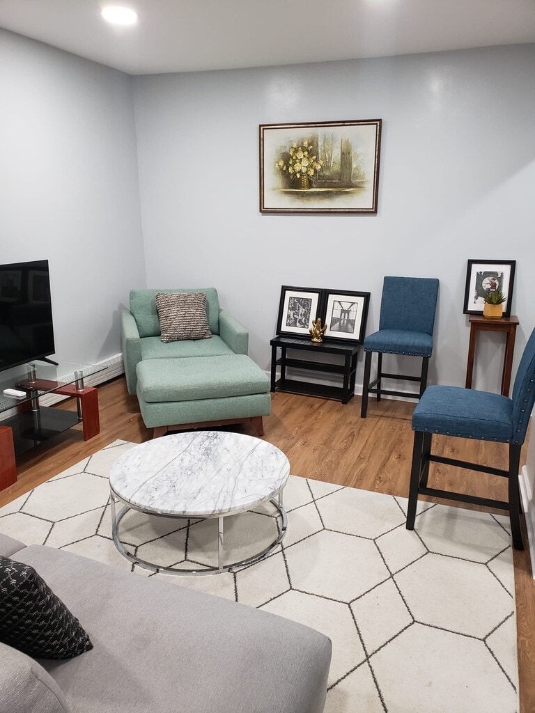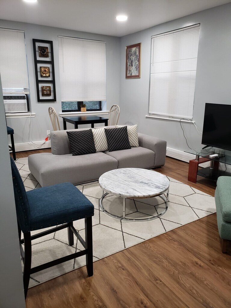 This is a lovely one bedroom apartment that is fully furnished for short term rental. Queen size bed with dresser, multiple closets and desk in a large bedroom. Living room is fully furnished. The kitchen is equipped with the sleek finishes and for cabinet space microwave stove and refrigerator. The living room has multiple seating options, an area carpet coffee table 50" smart TV and Wi-Fi all included. Additional utilities included are light, electricity,heat, hot water. Apartment is located on the 3rd floor of the building. Two blocks from 3/4 Train, B46, B14, B17. Nearby laundry mats, dry cleaners, local mom and pop shops. Lots of food options from franchises and independent restaurants of all cuisines. Additional items included... Iron and ironing board Blow dryer Coffee Maker Blender Flatware Cookware Dinnerware