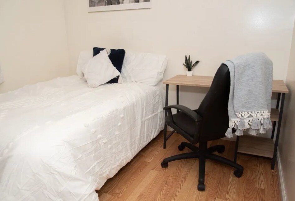 Recently updated first-floor 2-bedroom, 1.5-bathroom apartment with a private patio. The apartment comes furnished with beds, dressers, desks, and chairs.