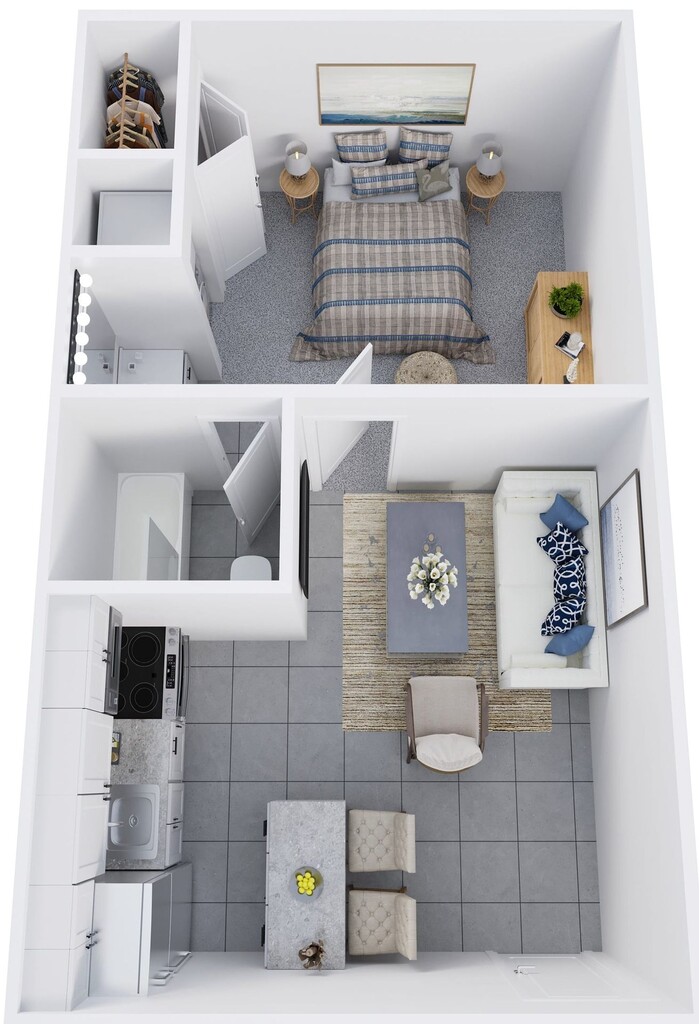 1 Dormitorio, 1 Baño, 550 pies²Disponible AhoraGalería del Modelo