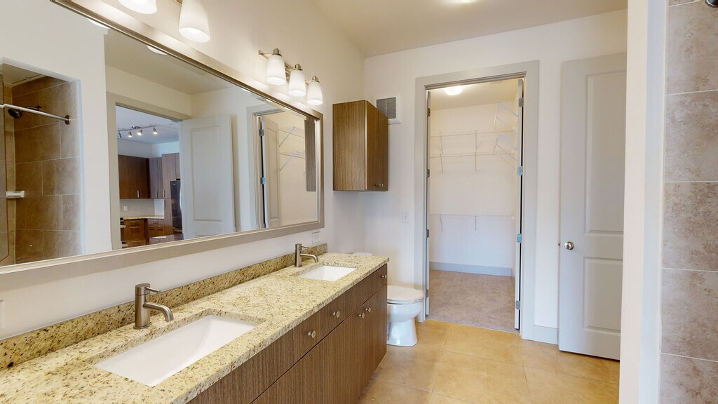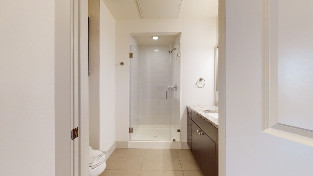 - Encimera con dos tocadores y duchas sin marco en apartamentos seleccionados