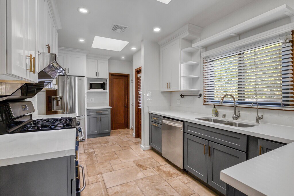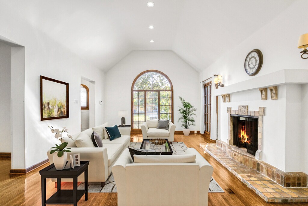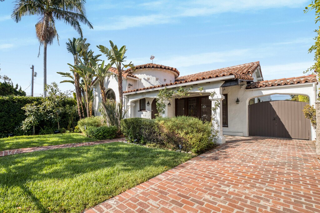 Spanish gem in prime Beverly Grove. Behind a secured front gate, this home blends original charm with modern updates. A covered front patio leads into a spacious living room with vaulted ceiling, Batchelder tile fireplace, and picture window flows to a formal dining room. Updated kitchen with stainless appliances and rotunda breakfast nook. Primary suite opens to a trellised deck and landscaped yard with thriving citrus trees; bath features double sinks, soaking tub, shower, and Toto smart toilet. Two more bedrooms in the main home plus a 650 sq.ft. ADU with a large flex room, full bedroom, and bath totaling the property at 4 bedrooms and 4 baths. Other highlights include full water filtration system, fresh paint, French windows, skylights, ample storage, and central AC. One of the best streets in Beverly Grove and walking distance to all the excitement on Melrose Ave and Beverly Blvd. Initial lease term must be 13 months or longer.