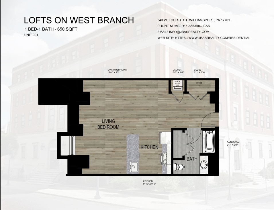 343 West Branch includes units ranging from 700-square-foot studios to two-bedroom apartments up to 1,600 square feet. Built in 1923, the building originally served as a YMCA dormitory and sits at the gateway to historic Williamsport. Rent includes water, sewer, garbage. Does not include electric or any optional services such as cable TV and internet.