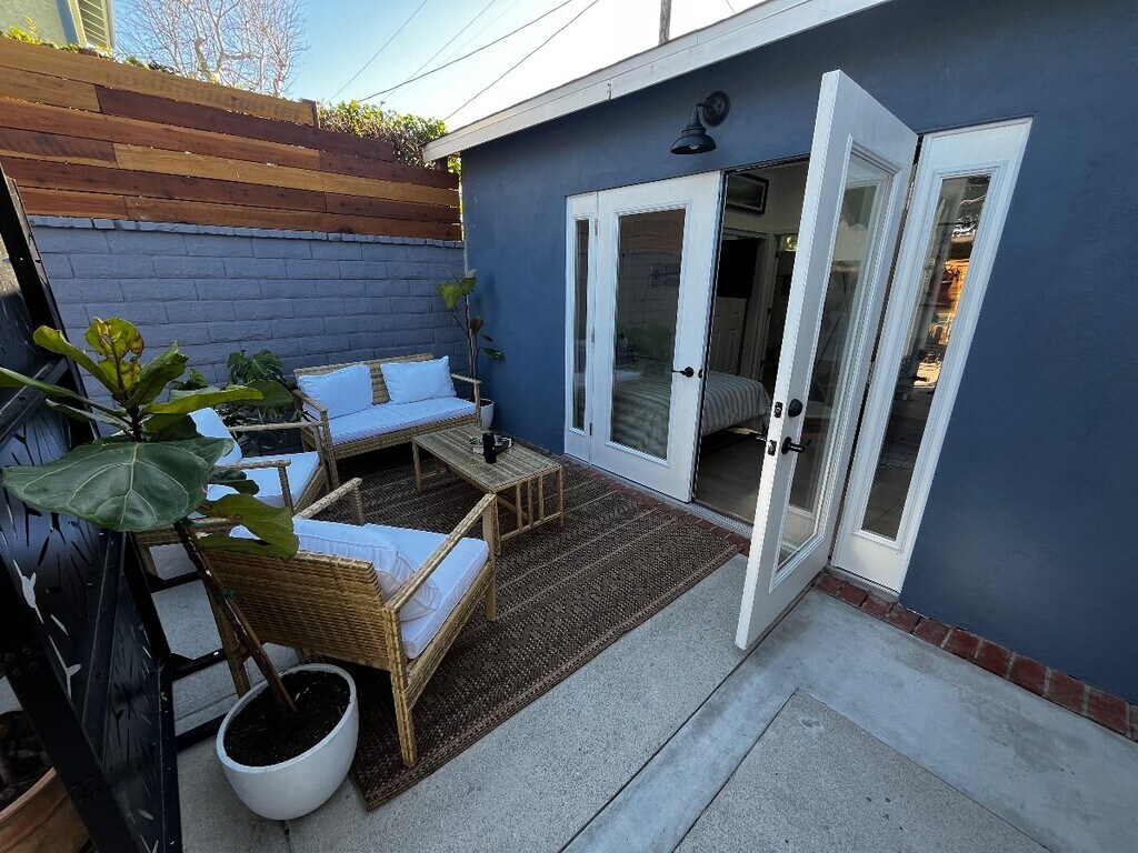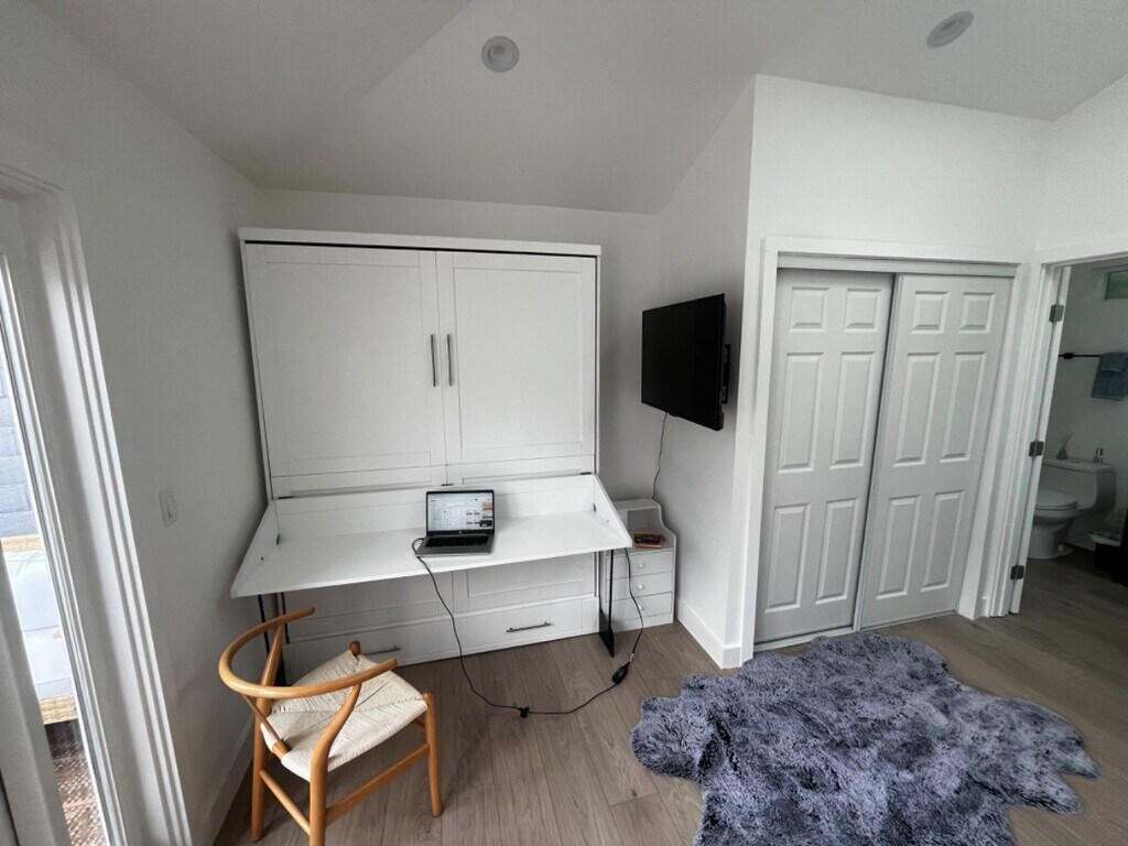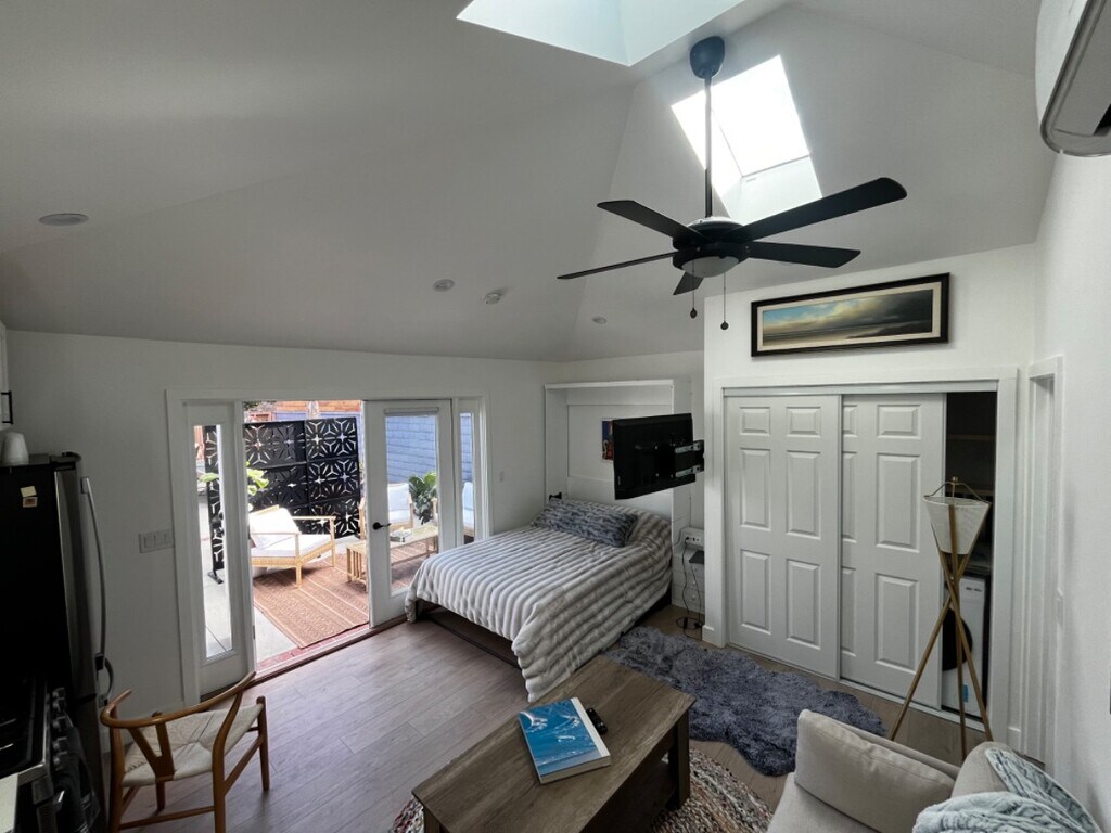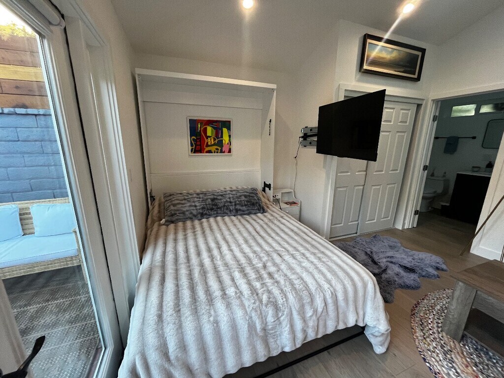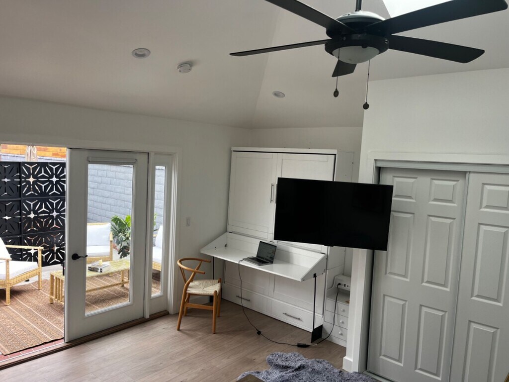 Our unit is newly constructed with a full kitchen, bathroom with rain shower, multiple sunlights, ceiling fan, ac/heat, smart TV on an oscillating wall mount and a Queen size Murphy Bed that folds up into a desk. There is a well stated private outdoor space with plants and furniture exclusively for your unit. NOTE: The washer/dryer in your unit is made for smaller loads. Not ideal for a lot of laundry use but convenient.