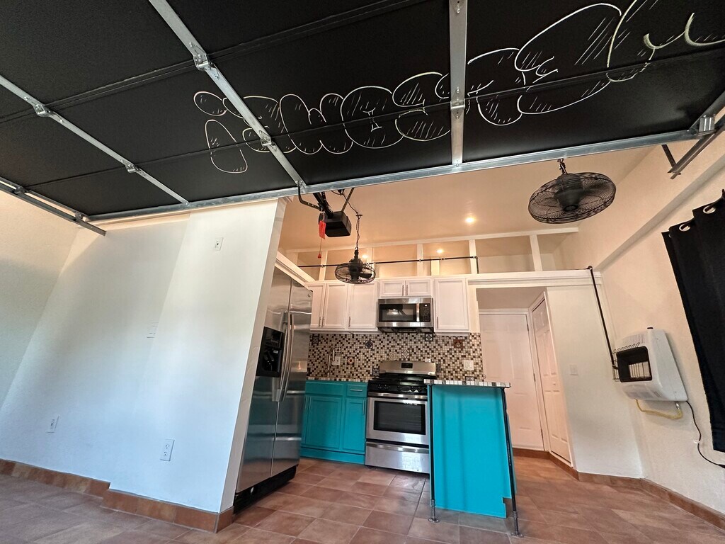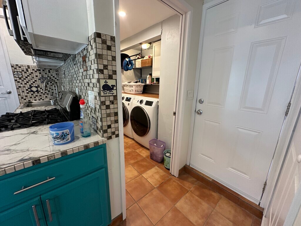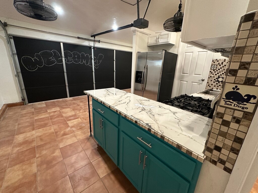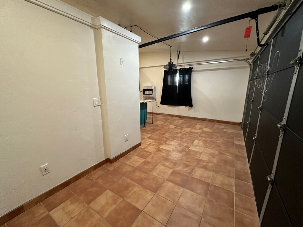 Private studio on quiet street in La Mesa. Private entrance. private full bath, personal kitchen, private patio space, shared laundry room in property, parking right in front. This is a small studio with a large feel! Converted from a large two-car garage, the space still retains the old garage door, fashioned into a usable chalkboard backdrop, which opens to reveal 3 stylish windows. Vaulted ceilings offer overhead storage space. A bar-style kitchen complete with fridge, oven/range, microwave, double-sink with disposal and ample cabinet space. From the side window you can view your personal fenced in patio area, which overlooks the hills of La Mesa. Exiting through your patio and out of your private gated entrance, you can walk directly to your vehicle parked safely in front of the property. The shared laundry room is located directly behind your kitchen, accessible to you from your side, and from the house through the other side of the room. There is also a standard sized closet in your unit, with coatrack and shelf, next to the laundry room. A simple to use gas heater provides individual heat for your unit in the winter, and overhead fans help keep cool in the summer. No Air conditioning, but you are welcome to use your own non-permanent indoor unit. Floors are tile throughout, with tile walls and exposed copper plumbing for the bathroom. The shower features both an overhead rain-style showerhead and handheld shower. A shelf, vanity and medicine cabinet offer storage space for toiletries. Trash and recyvling is located near the front of the poroperty, and wi-fi is included. The property is part of a well-maintained HOA neighborhood, with a community park, playground and swimming pool across the street.