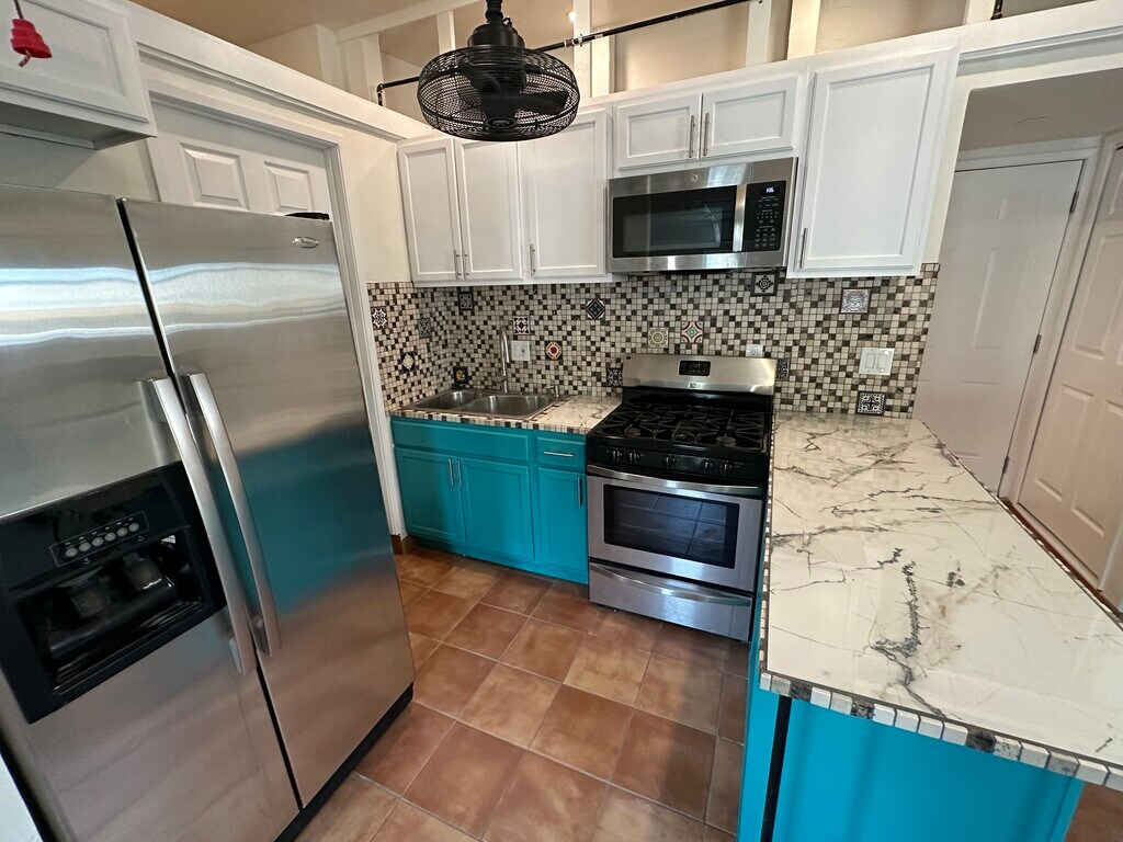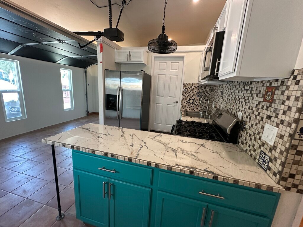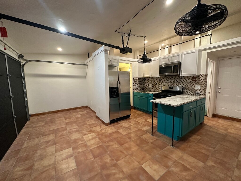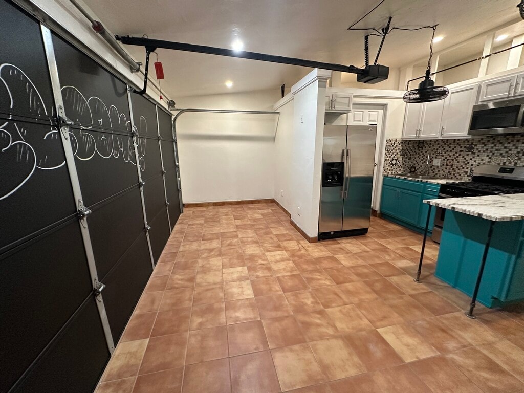 Private studio on quiet street in La Mesa. Private entrance. private full bath, personal kitchen, private patio space, shared laundry room in property, parking right in front. This is a small studio with a large feel! Converted from a large two-car garage, the space still retains the old garage door, fashioned into a usable chalkboard backdrop, which opens to reveal 3 stylish windows. Vaulted ceilings offer overhead storage space. A bar-style kitchen complete with fridge, oven/range, microwave, double-sink with disposal and ample cabinet space. From the side window you can view your personal fenced in patio area, which overlooks the hills of La Mesa. Exiting through your patio and out of your private gated entrance, you can walk directly to your vehicle parked safely in front of the property. The shared laundry room is located directly behind your kitchen, accessible to you from your side, and from the house through the other side of the room. There is also a standard sized closet in your unit, with coatrack and shelf, next to the laundry room. A simple to use gas heater provides individual heat for your unit in the winter, and overhead fans help keep cool in the summer. No Air conditioning, but you are welcome to use your own non-permanent indoor unit. Floors are tile throughout, with tile walls and exposed copper plumbing for the bathroom. The shower features both an overhead rain-style showerhead and handheld shower. A shelf, vanity and medicine cabinet offer storage space for toiletries. Trash and recyvling is located near the front of the poroperty, and wi-fi is included. The property is part of a well-maintained HOA neighborhood, with a community park, playground and swimming pool across the street.