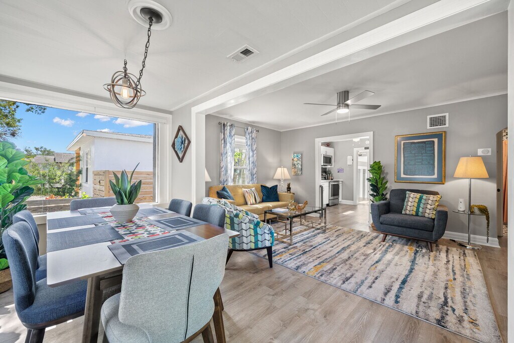 Fully Furnished 3BR/2BA Home - Ideal for Corporate Stays or Relocation. NOT IN A FLOOD ZONE. - all utilities included (electricity, gas, water/trash, internet, cable, streaming) - TV in each room - fully stocked (bedding, kitchenware, decor etc.), just bring your clothes ! - close to downtown and beaches - luxury wink mattresses and furnishings - enclosed pet friendly front yard and convenient off street parking Jasper House is a premium, comfortable house nestled in the United Central neighborhood in St. Petersburg. Within a short distance of Tropicana Field, multiple bars, and eclectic restaurants. Soak up the modern yet vintage charm of this fully remodeled 1920's three-bedroom two-bathroom house with all new premium stainless steel appliances. This space is comfortable and inspiring; perfect for a Florida getaway! Enjoy a 65" tv in the living room and a tv in each bedroom. We have blazing fast WiFi, streaming TV services, and a cozy space to relax and recharge- all within minutes of some of St. Petersburg's most sought-after attractions. Amenities includes; a huge master bedroom with a king size bed and en-suite bathroom, a full size washer and dryer, a fenced in front and side yard with multiple seating areas for your relaxation, covered patio area and two dedicated workspaces . Centrally located near a SunRunner stop which will take you to St Pete Beach or downtown saving you the hassle of finding a parking space or paying for it. Jorgensen Lake Park is a 4 min drive away and a great place to relax. Close to Downtown St. Petersburg, major roadways, schools, government offices, shopping, dining, concerts, nightlife and the sunning beaches of Florida's west coast. Concerned about parking? You will have access to a private driveway for free parking. We have spared no expense to make sure you will enjoy your time at this home. You will find a luxury award winning mattresses in each bedroom, a well-equipped fully stocked kitchen and an outdoor oasis which includes a hammock. Beach chairs and beach towels are available at the property. 12 month lease. Rent: $3,475/month All Utilities: $400/month fixed fee (includes electricity, water, gas, trash, 1 GB internet, streaming services, termite warranty, pest control ) Total Monthly Cost: $3,875
