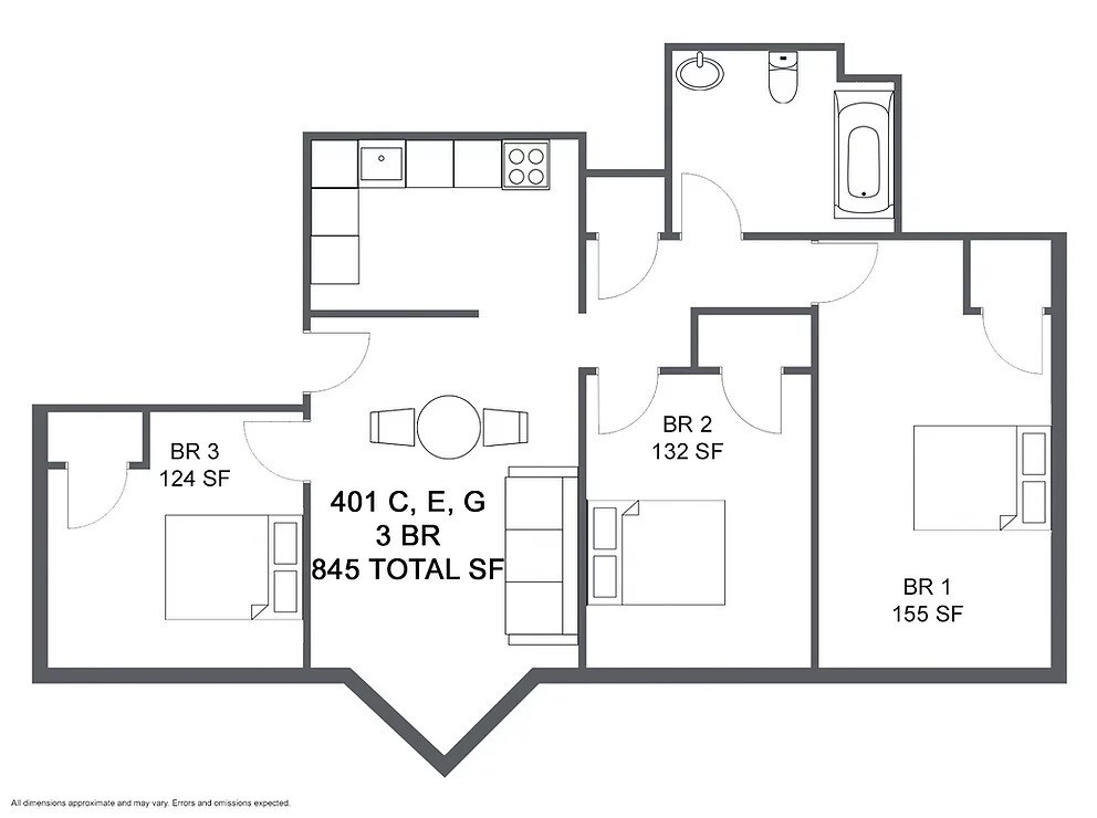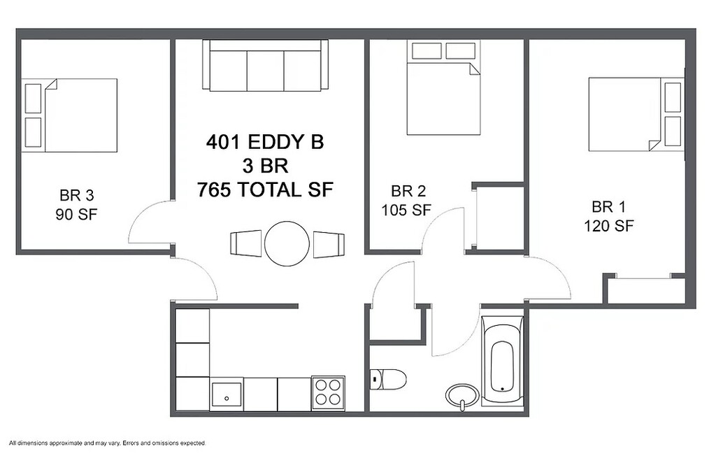 This is a three-bedroom apartment at 401 Eddy St. The living room has two couches and a coffee table. The kitchen has a pass-through window to the dining table set. The kitchen is equipped with ample counter space, several cabinets, and a microwave. Each bedroom has a double bed, a dresser, and a desk set. Every bedroom also has a large window which allows for plenty of natural light. There are three closets in this unit. The bathroom is large and includes a bathtub with mirrored shower doors. 24/7 recorded security camera suite from ADT.