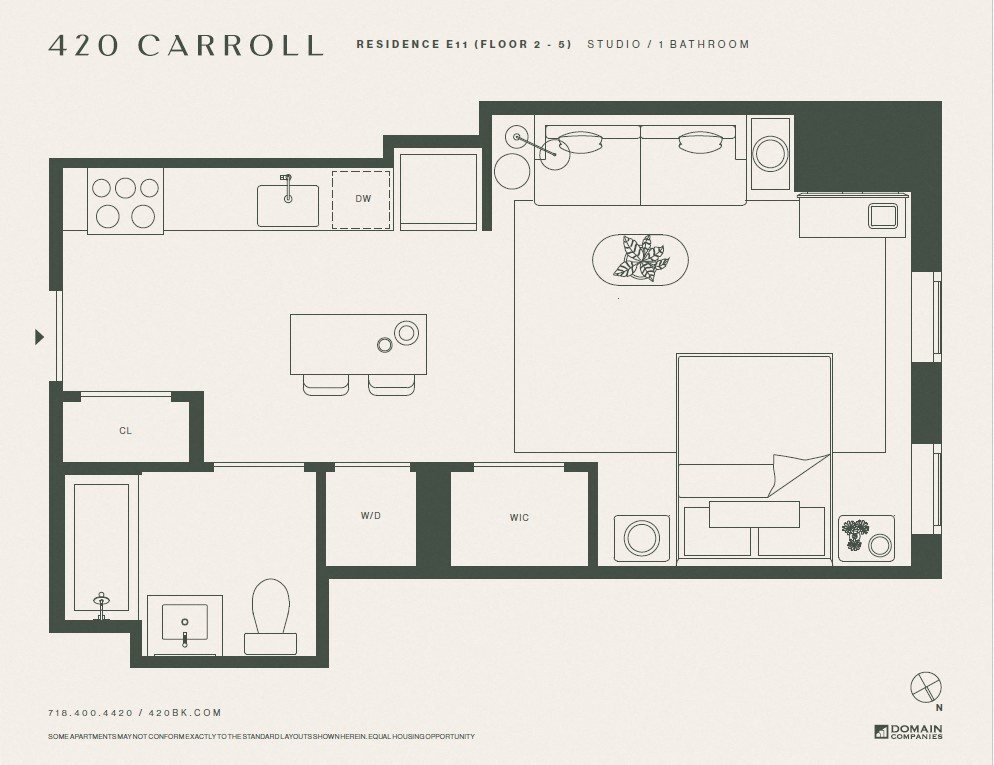 In a neighborhood known for makers, 420 Carroll is crafted to fit in and stand out. The buildings façade, clad with patterned metal panels, introduces a fresh geometric design that contrasts beautifully with the tree-lined streets, and in the heart of Brooklyn, a serene waterfront home awaits.Airy, light-filled spaces are at once sophisticated and elevated with the warmth and comfort of home. Generous, open Studio to 3-bedroom floor plans and custom kitchens and baths set the tone for modern living. Soothing neutral tones, modern finishes and warm natural light compliment every detail perfectly.