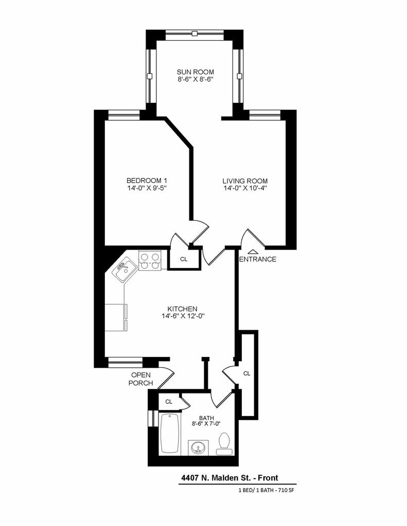 One Bed Front 07 and 09 - Plano 1 Unidad de apartamento: 4409-1FModelo de apartamento: One Bed Front 07 and 091 Dormitorio, 1 Baño, 710 sq ftDisponible March 1, 2026One Bed Rear 07 and 09