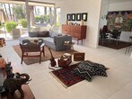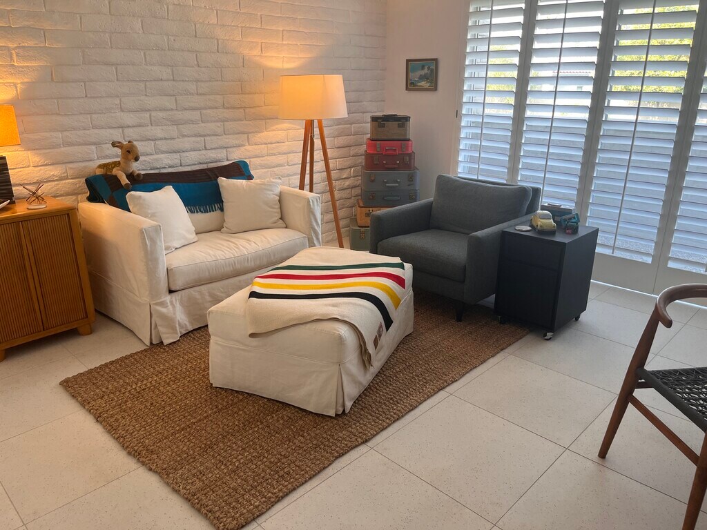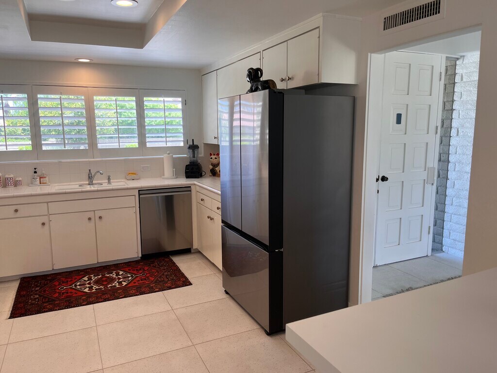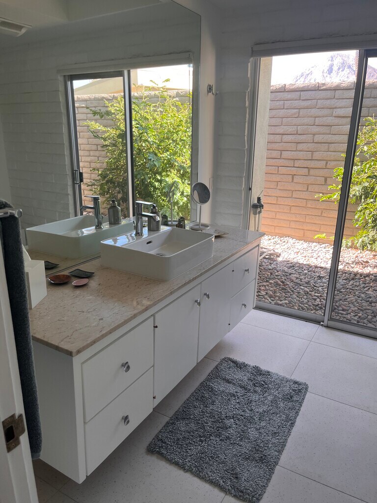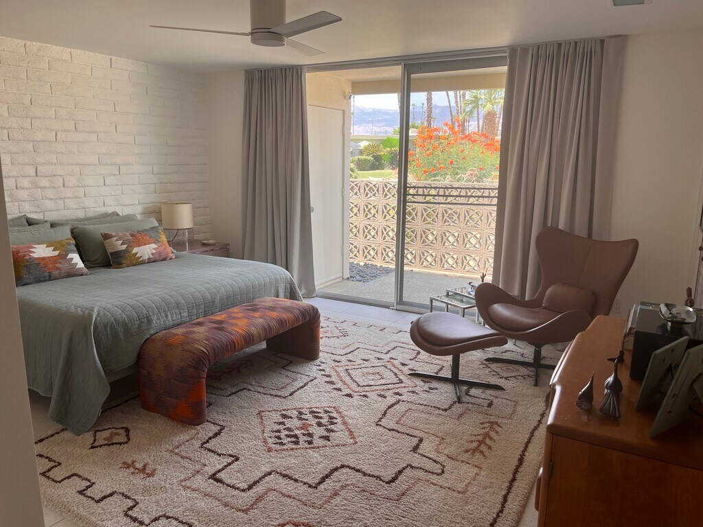 Alquiler mensual (mínimo de 30 días) en un dúplex de mediados de siglo (casa) ubicado en el corazón de Indian Wells. Disfrute de este tranquilo oasis en el desierto en un hogar decorado estéticamente con fantásticas vistas al agua, al cinturón verde y a las montañas de Santa Rosa. Cuenta con un plano abierto con tres dormitorios grandes (un dormitorio equipado como oficina/mueble con sofá cama), dos baños con acceso a un patio privado, una gran habitación con chimenea a gas, una amplia cocina abastecida, un comedor con área de bar con fregadero, lavandería en la unidad, un amplio patio privado amueblado y patios, mucho armario y espacio de almacenamiento y un amplio estacionamiento en una comunidad cerrada. La comunidad de Casa Dorado (est. 1964) es una comunidad cerrada de mediados de siglo de solo 50 unidades dúplex (solo 1 pared común) con hermosos jardines ornamentales, una casa club para eventos especiales, 2 canchas de tenis, 6 piscinas, 4 spas y un campo de golf de 4 hoyos. DETALLES DEL INTERIOR Interior habitable total: 180 m2 Amueblado: 3 dormitorios y 2 baños Pisos: alfombra, azulejos Comodidad: calefacción central, aire acondicionado Electrodomésticos: lavavajillas, triturador de desechos, horno de pared, placa de cocción eléctrica, microondas, refrigerador con agua filtrada y máquina para hacer hielo, wet bar y lavandería unitaria con lavadora/secadora apilada. Ventanas: persianas, cortinas y persianas de plantación Otras características: comunidad cerrada, paredes interiores de ladrillo, patio privado, patio amueblado, chimenea con arrancador a gas, piscinas y spas con temperatura regulada, canchas de tenis, campo de golf y putt El alquiler incluye: estacionamiento ilimitado en la calle, cuotas de HOA, jardinería, Wi-Fi, Smart TV Samsung y LG (Wi-Fi/Internet habilitado, Roku, Spectrum), barra de sonido Bluetooth, unidad amueblada con cocina abastecida, ropa de cama básica y ropa de cama. Alquiler: $3,800 por mes más servicios públicos (gas, agua y electricidad) facturados mensualmente.