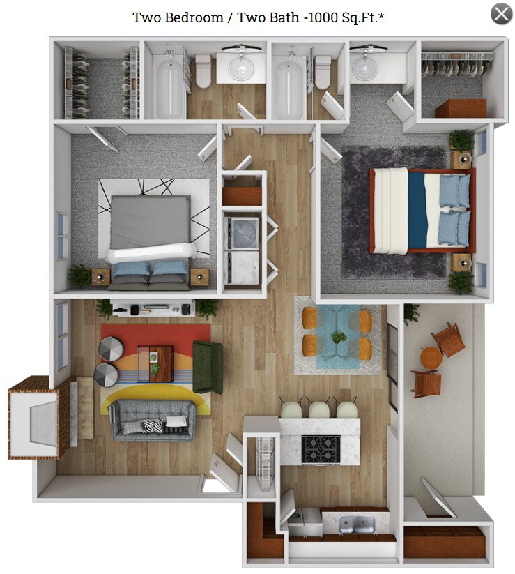 Modelo de apartamento: 2x1Desde $1,3952 Dormitorios, 1 Baño, 874 sq ftDisponible Ahora![]()