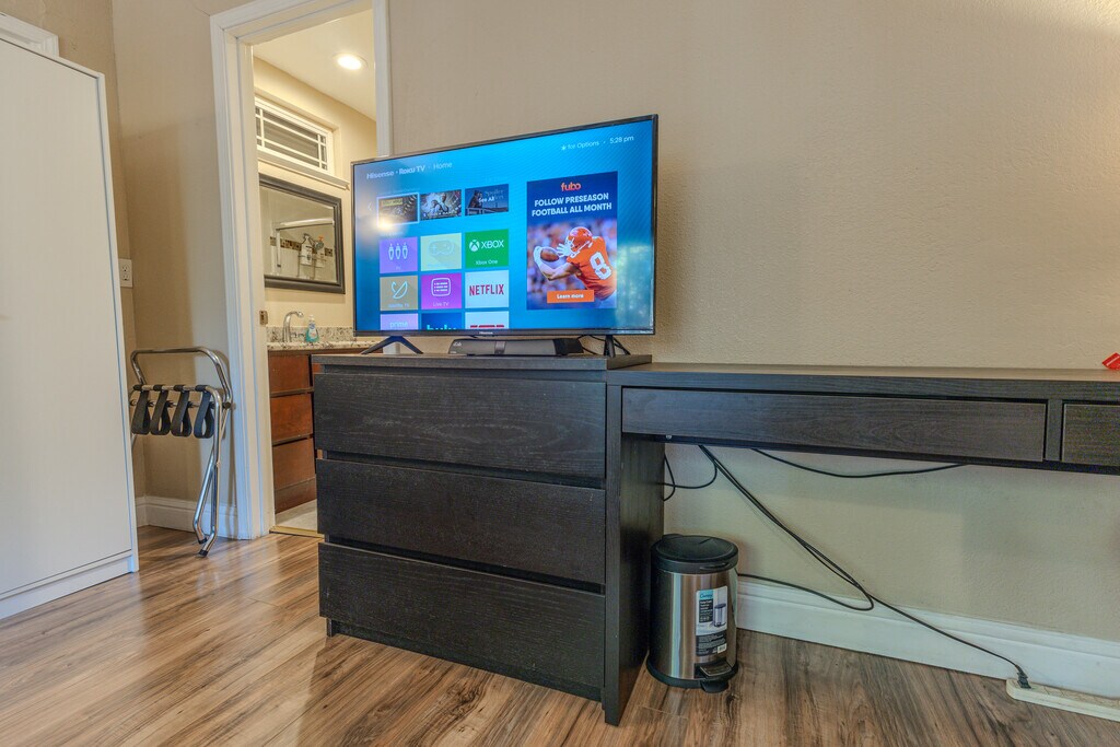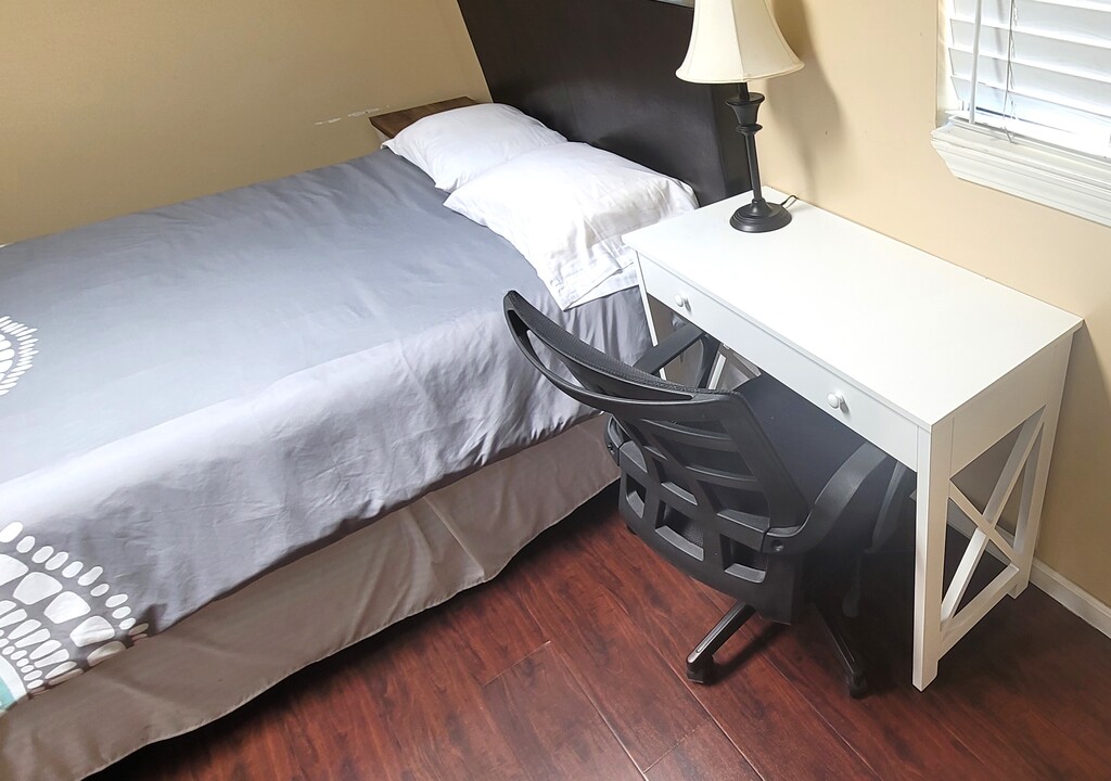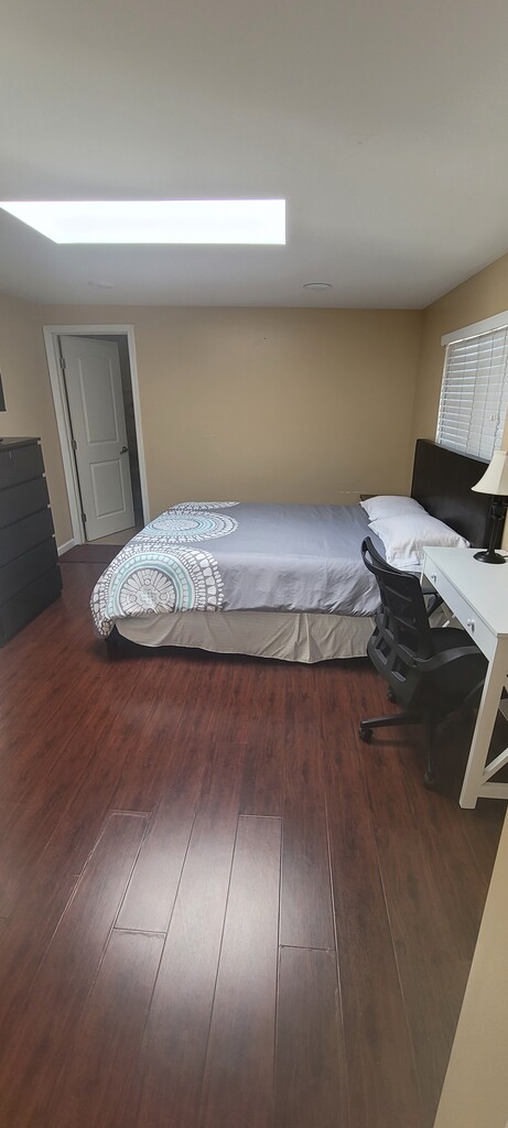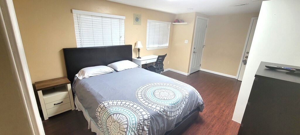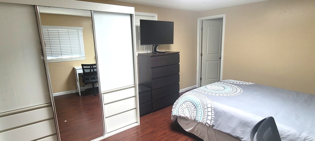 Large master bedroom with bath and a private entry. All utilities included. Perks: Coffeemaker, mini fridge, microwave Queen bed , iron & board, hair dryer Private full bathroom Desk/chair Tv, Wi-Fi Street parking Location: Close to freeways Walk to VTA train station and short drive to Diridon station Nearby Santana Row, San Pedro Square, Stevens Creek Mall, Valley Fair Mall 15 mins to SJ Airport 35 mins to Santa Cruz 45 mins to SF Info: No smoking, drugs, or pets Walk to grocery stores