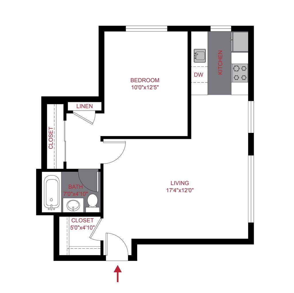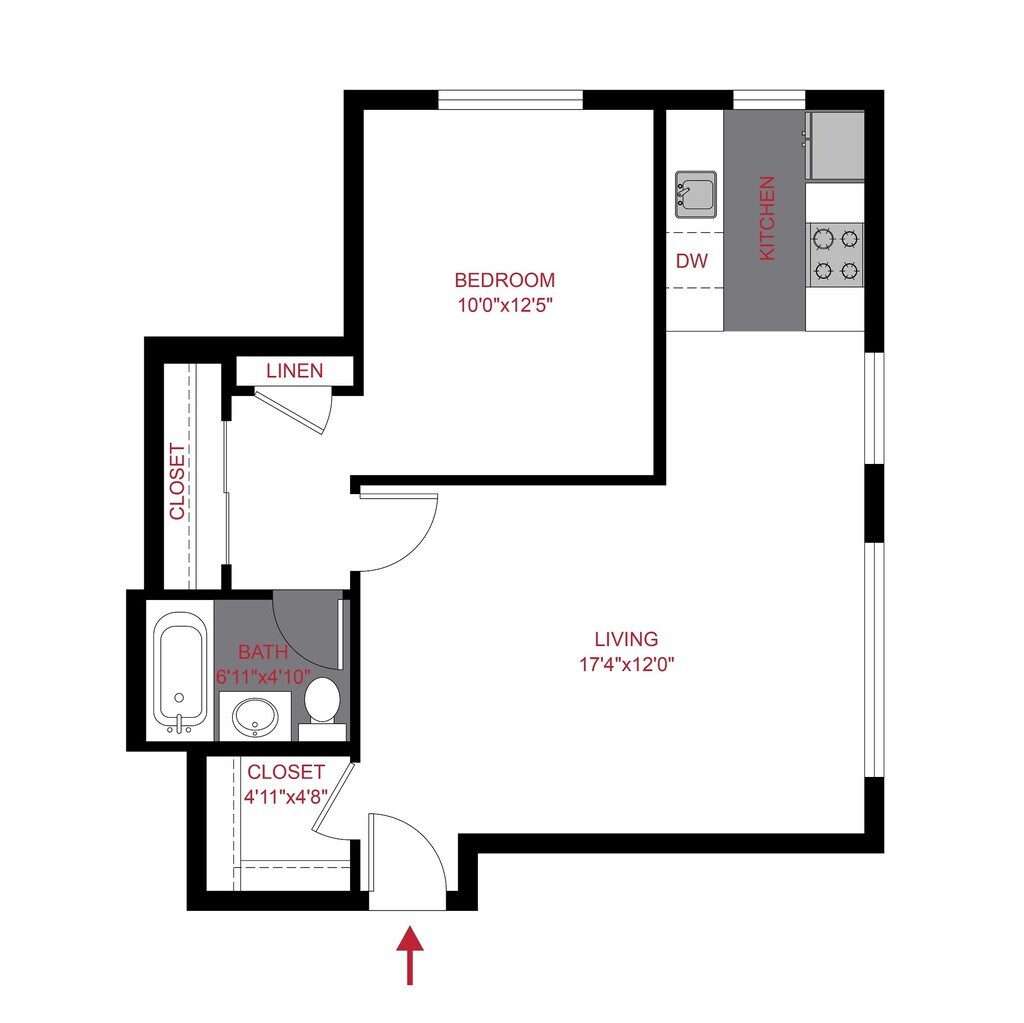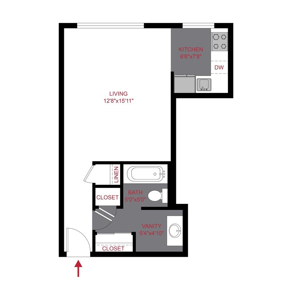 Modelo de apartamento: 251.A11 Dormitorio, 1 Baño, 530 sq ftDisponible Ahora![]()