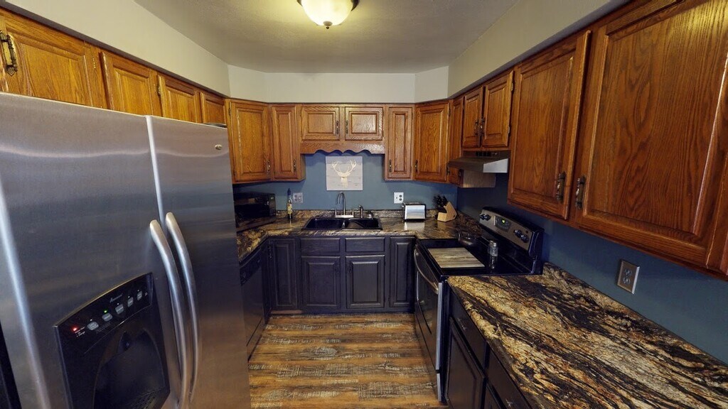 Llamada el Blue Deer Penthouse, este apartamento cuenta con todas las mejoras que incluyen lavandería en el apartamento, electrodomésticos de acero inoxidable con dispensador de hielo, lavaplatos, una chimenea a leña, y de una gran cantidad de comodidades diseñadas para hacer que este amplio apartamento de lujo se sientan como en casa. Ambos habitaciones en este apartamento son muy amplios, con cama King y juegos de habitación con cama Queen. Tenemos una segunda ventana emergente cama individual que se adapta a fácilmente en la segunda habitación con ropa de cama que coincida con el amplio terciopelo cama Queen. El concepto abierto de kitchen-dining-living área es amplia y cuenta con un moderno diseño brindan el tema de ciervos locales en medio de día polvoriento de azules y acabados de vidrio y cromo. El estilo de este lugar es el lugar donde la Northwoods y urbano, Wisconsin lado se conecta. Actualización recientes desde las fotos incluyen una nueva encimera de granito.
