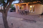 Large 5BR, 3.5 bath home includes 3BR / 2.5BA Main House, plus attached 2BR / 1BA Casita. Main house has central AC and Heat, large kitchen with stainless steel KitchenAid appliances, including gas range, microwave range hood, dishwasher and refrigerator. Quartz countertops, separate dining room area with views of giant Saguaro cacti and Black Mountain. 1+ acre lot, fenced and gated. Living room with gas fireplace and bay window with built-in bench seating. HDTV and movie lights on dimmer. Livingroom furnished with plush sofa and leather chairs and wood coffee table. Bar seating in Living room faces kitchen. Half bathroom off of dining room. Spa area and sun lounges outside living room. Outdoor dining furniture includes table with 4 chairs. Bar seating has 3 chairs. Large primary bedroom suite on first floor with King bed, nightstands and lamps, wardrobe, HDTV, and ceiling fan. Private attached bathroom, with large shower, vanity and toilet room. Off this bedroom, there is a walk-in closet and laundry area with a full sized washer and dryer. Upstairs, 2 additional bedrooms: Large bedroom with Queen Bed, night stand, dresser and sofa. 3rd bedroom with Twin bed, HDTV, and fold out leather sofa. Bedrooms have closets and additional storage. Shared upstairs bathroom has sink, toilet and tiled shower/tub combo. 2 Bedroom Casita also has a full kitchen with refrigerator, gas range, sink and island cart with microwave. Water purifier and garbage disposal. Full bathroom with sink, shower, toilet. In-unit laundry center, Fully furnished with Leather couch and leather recliner, live edge coffee table, dining set with 6 chairs, HDTV, A/C unit, Fireplace heater, Queen bed, leather bench, nightstands and lamps, desk, chair, dresser and Twin bed in 2nd bedroom. Outdoor patio furniture and private BBQ on each patio - one set for Main House Yard and one for the casita yard. Rent for full property (3 BR 2.5 BA Main House and 2 BR 1BA Casita) is $5500/mo with a 1 year lease. Homes can be rented separately for $3000/mo (3BR) and $2500/mo (2BR) with 1 year lease.