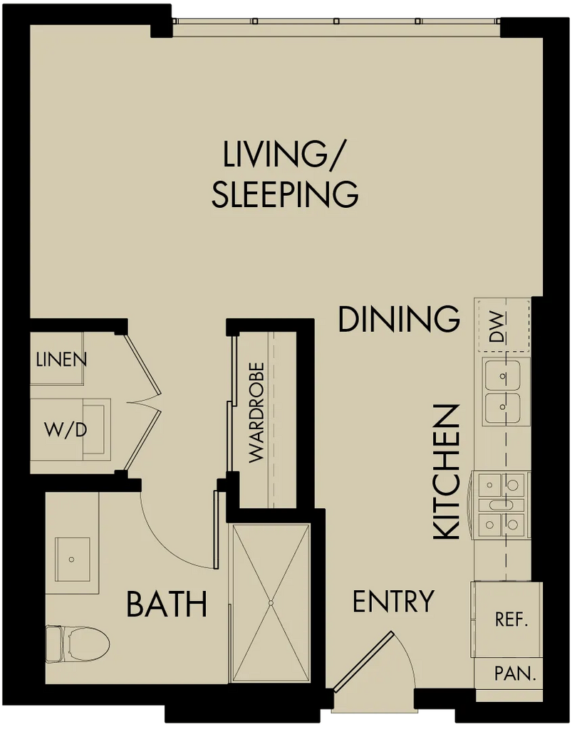E01 - Plano Unidad de apartamento: 1-128Modelo de apartamento: E01$2,883Estudio, 1 Baño, 506 sq ftDisponible Ahora1 Dormitorio