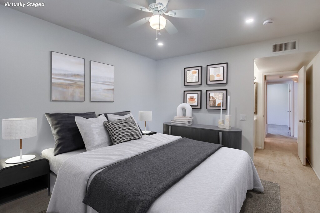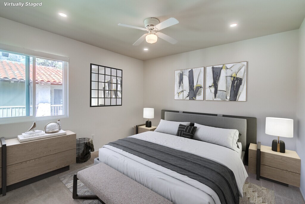 2 bedroom, 2 bath, upper end unit. Stair access only. Split floor plan for privacy. Free parking. Pool, hot tub, modest gym, and tennis courts included in rent. Easy access to freeways. Walk to restaurants and trolley.