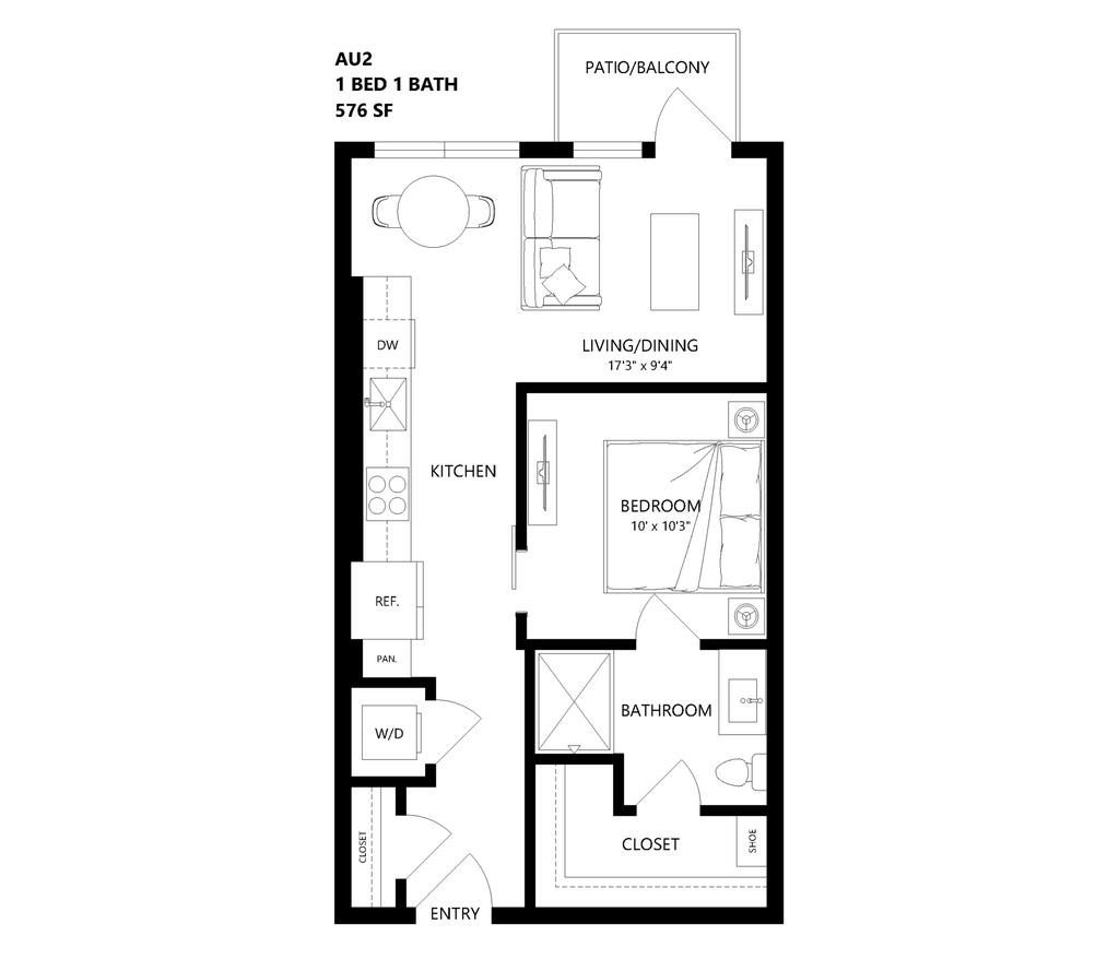 Modelo de apartamento: AU2Desde $1,572Estudio, 1 Baño, 576 sq ftNo Disponible![]()