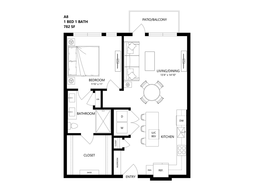 A8 - Plano 1 Unidad de apartamento: 313Modelo de apartamento: A8$1,7781 Dormitorio, 1 Baño, 782 sq ftDisponible AhoraPlano: A9
