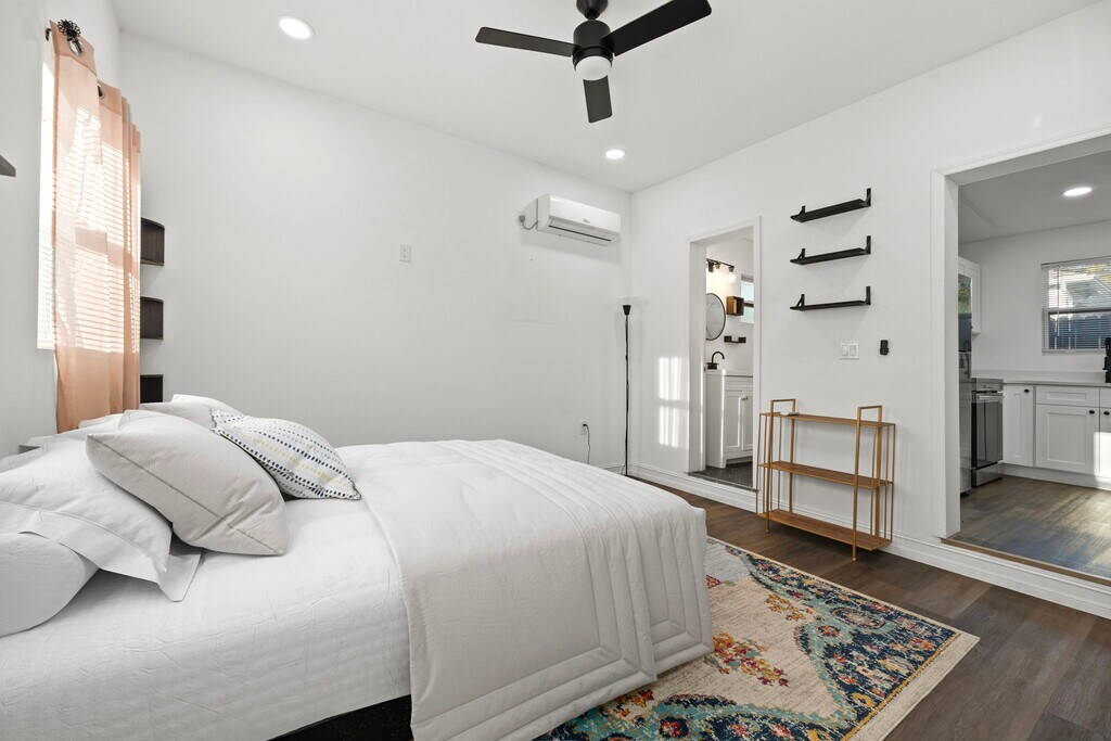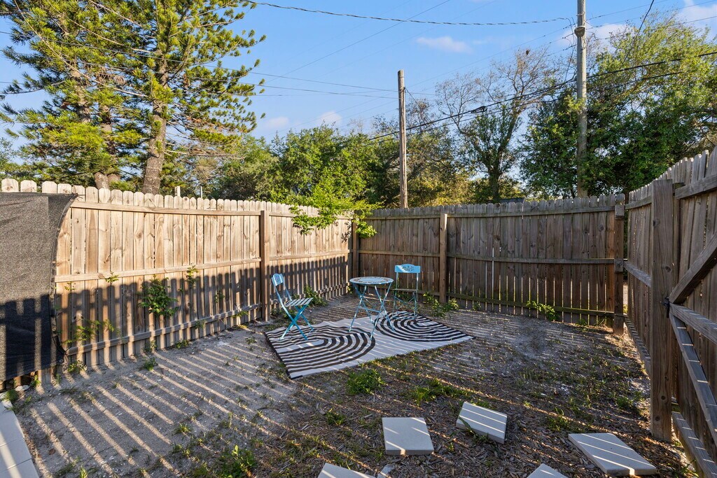 This is a recently remodeled studio apartment in a central location. The studio has a separate kitchen area and bathroom, laundry access, a private, fenced patio/yard area, an included parking space, and flat rate utilities. The kitchen is equipped with a full range and oven, a dishwasher, and a standard refrigerator/freezer. The floors are tile and high-end vinyl. The A/C unit is a quiet and efficient mini-split. The yard/patio area includes lawn furniture. It is located in the peaceful, tree-lined Central Oak Park neighborhood, which, as the name suggests, is centrally located. It's a 10 minute drive to the St. Pete pier, a 12 minute drive to Treasure Island Beach, 4 minutes to Publix and Winn-Dixie, 3 minutes to a Walmart Supercenter.