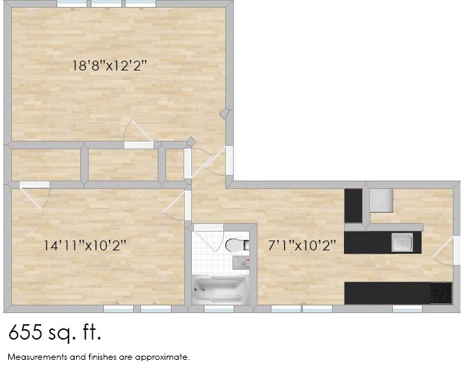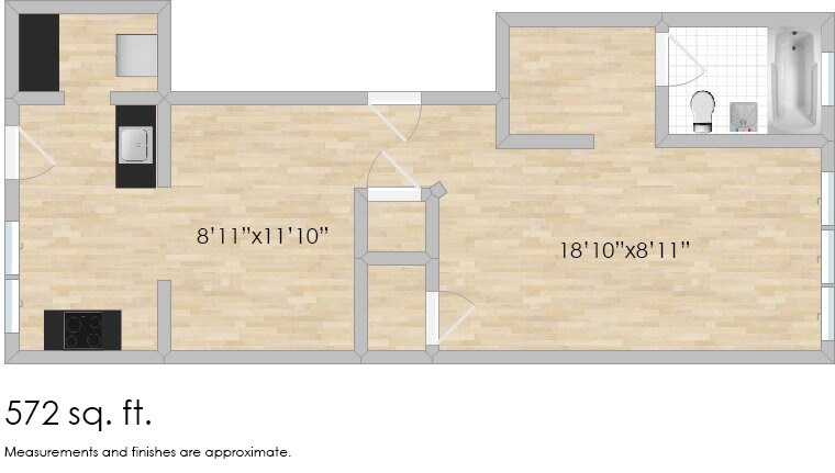 Modelo de apartamento: 640 HarrisonEstudio, 1 Baño, 572 sq ftDisponible December 31, 2025![]()