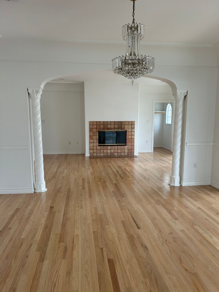 For rent is a 3 bed, 2 bath home in the upstairs unit of a duplex, offering over 2,000 sq. ft. of living space. Recently renovated throughout, this home features a fully remodeled kitchen with brand-new quartz countertops and a full appliance package, including a farmhouse-style sink, new refrigerator and new dishwasher. The kitchen also includes a sunny breakfast nook and a brand-new walk-in pantry. The layout boasts a spacious living room with a functioning gas fireplace and ceramic logs, a separate dining room, and additional breakfast area. The home is filled with immense natural light thanks to expansive curved French-style windows, three skylights, and recessed lighting throughout. The oversized master suite includes a large walk-in closet with built-ins and direct access to a private balcony. The en-suite master bath offers dual Jack & Jill sinks, a soaking tub with jets, and a walk-in shower. Both bathrooms are full baths. Additional bedrooms feature generous closets, and every room includes ample storage space. Freshly painted and outfitted with new recessed lighting in every room, the unit also includes a brand-new washer and dryer, as well as central air for year-round comfort. Outdoor amenities include two balconies (front and off the master suite), as well as access to a shared backyard with a grassy area and large courtyard, maintained regularly. Parking: One designated parking space is provided in the gated driveway. Additional parking is plentiful on the quiet, permit-only residential street, limited to residents of the block. Additional Details: -Fully enclosed property with gated driveway -Over 2,000 sq. ft. of living space -New appliances and washer/dryer included -Ample storage with large closets in every room -Shared backyard and courtyard -Pets considered with additional pet rent (additional $50/pet/month).
