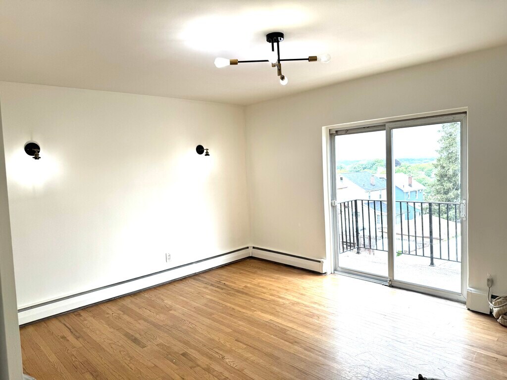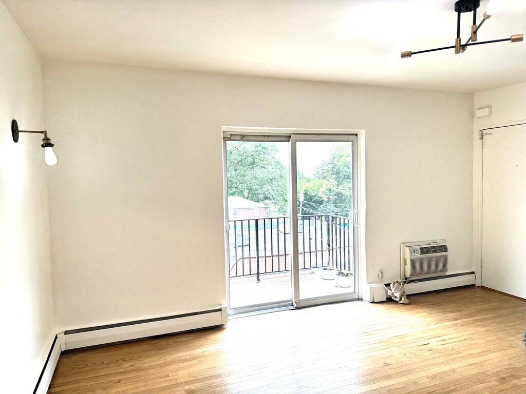 Clean, bright 2-Bedroom apartment with updated bathroom and EIK. This apt offers a generous size welcoming LR with sliding doors to an outside open terrace facing west. Terrace is perfect for relaxing or taking a sunset view. Unit also offers wall air conditioner in LR, HDW flooring and respectable closet space. Located in the heart of town, everything is steps from the front door such as: NYC Express bus, banking, shopping, worship, hair salons, local eateries, and plenty of take out food establishments. Unit also provides designated parking for one car, handyman and on-site laundry. Pets are not permitted. This apartment requires respectable credit score, proof of income, identity and 1.5 month security Owner pays for water, tenant pays all utilities.