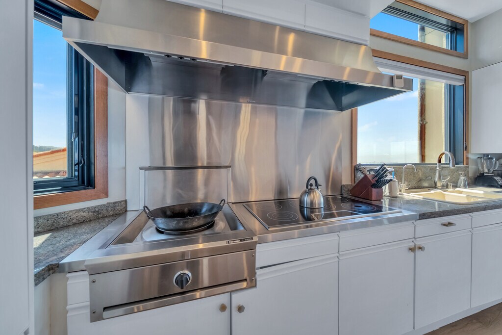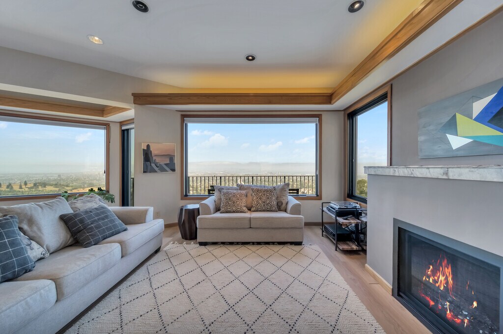 One of the best view properties in the East Bay, located in Hiller Highlands with no homes or trees blocking the view of the Bay and San Francisco. Three story, fully-furnished home of almost 4000sf. Two master bedrooms on the top floor, each with its own balcony and four bridge view. Indoor jacuzzi between the two master bedrooms. The middle floor has the kitchen, dining room, and living room in an open floor plan with four bridge views. Middle floor also has a separate TV room and balcony with a BBQ and view of East Bay hills. Lower level has three bedrooms, two of which have 3 bridge views. Modern kitchen with professional wok. Security is provided by attractive glass gates and a Bay Alarm system. The lower level has a second entrance, and the two smaller bedrooms and half-bath can become an office and waiting room that is locked-off from the rest of the house, if desired. This makes the home a three bedroom, 3.5 bath house with a separate office/waiting room/half-bath. The office has the magnificent view. Windows have been upgraded to keep out freeway noise and heat. The home has a solar system, batteries and two heat pumps; one that provides heat/cold for the top two levels; one that provides heat/cold to the lower level. Two car garage with automatic door, plus additional parking pad. Street parking as well. Laundry room with full-size LG washer and dryer. Furnishings can be removed in whole or in part for a long-term tenant. The home is located two minutes from Highway 24; it is easy to get on the freeway to San Francisco or Walnut Creek. One year lease minimum. Renter pays for all utilities and garbage. House has solar and batteries, so the cost of utilities is minimal. Water bill is minimal because there is no landscaping other than a small garden in the entryway that renter will be asked to water periodically.
