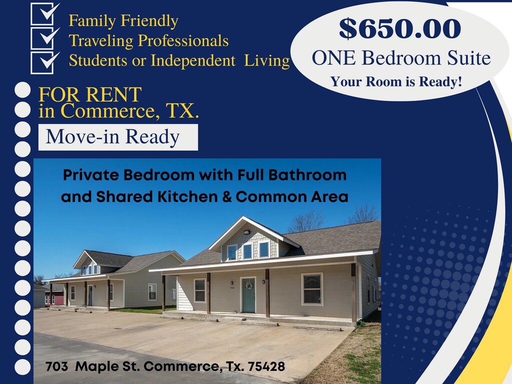 This space is ideal for those seeking affordability without sacrificing comfort. For $650.00 per month, enjoy a private suite with a full bathroom, plus access to a shared kitchen and common area. Located at 703 Maple St. in Commerce, TX, just 1.5 miles from East Texas A&M University, one suite remains available, perfect for students or young professionals wanting privacy and community. The home is smoke-free and pet-free, featuring central heating and air conditioning, spacious closets, and a common living area with granite counter tops. A $49 application fee applies, and guarantors are accepted. Experience affordable living with a private suite that includes a spacious bedroom and large walk-in shower.