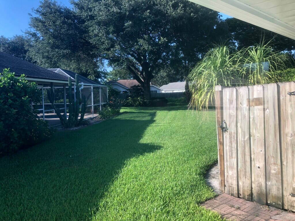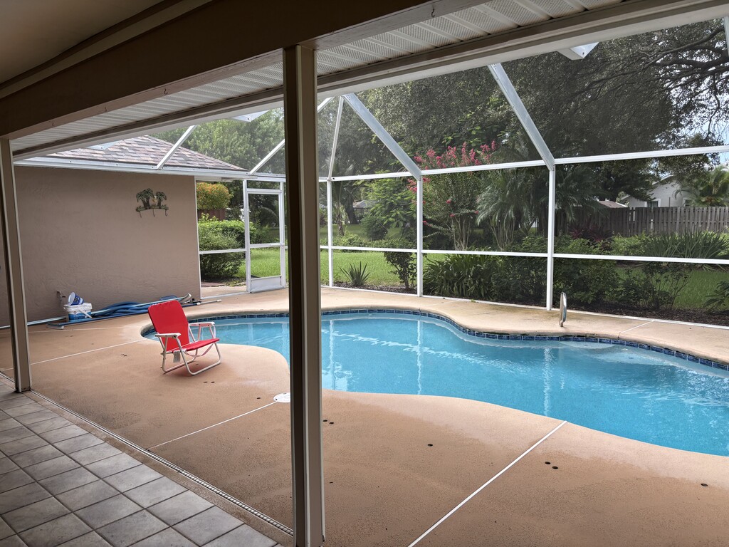 Cathedral ceilings, split bedroom, all bedrooms have walk in closets. Screen in pool, house located within a cul-de sac, Brand new roof, new central Rheem AC, water pump for sprinklers, gas stove and gas hook up for grill, guest bathroom leads to pool, privacy as yard on side and back is totally private. Floors are a combination of tile, laminate and carpet. Perfect home for family as it is a split bedroom with formal living room dining room and family room, all having sliding doors leading to screen in pool