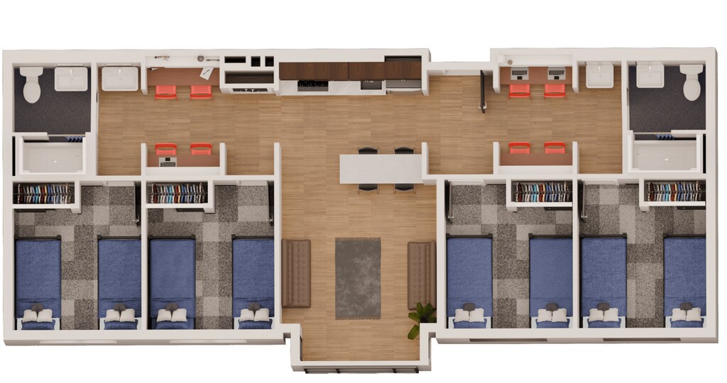 - Furnished Four-bedroom, eight-person units (assigned as doubles) with two full bathrooms
