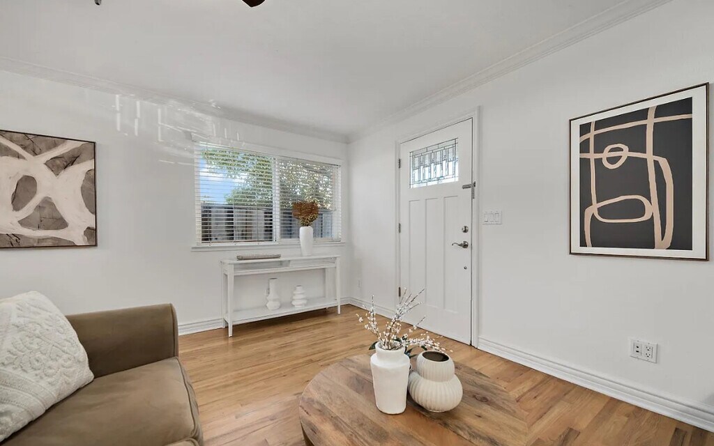 This beautifully updated 1-bedroom 1-bathroom Unit~~This beautifully updated 1-bedroom 1-bathroom Unit offers modern living with exceptional convenience. This One bedroom apartment end unit is truly a gem, boasting a private entrance and carport parking. With thoughtful upgrades throughout, this home is ready. Property Features: Spacious open floor plan enhanced by wood flooring and crown molding. Kitchen featuring custom wood cabinets, granite countertops and stainless-steel appliances, this kitchen is perfect for cooking and entertaining. Primary Suite Retreat: The generously sized bedroom includes built in cabinetry, a walk-in closet and updated en-suite bathroom. In-Unit Laundry with stacked washer dryer. A rare find in a boutique community offers a serene setting.