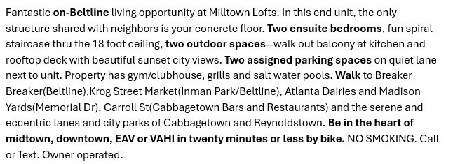 Fantastic on-Beltline living opportunity at Milltown Lofts. End unit, only structure shared with neighbors is your concrete floor. Two en suite bedrooms, fun spiral staircase thru the 18 foot ceiling, walk out balcony at kitchen and rooftop deck with beautiful sunset city views. Two assigned parking spaces on quiet lane next to unit. Property has gym/clubhouse, grills and salt water pools. Walk to Breaker Breaker(Beltline),Krog Street Market(Inman Park/Beltline), Atlanta Dairies and Madison Yards(Memorial Dr), Carroll St(Cabbagetown Bars and Restaurants) and the serene and eccentric lanes and city parks of Cabbagetown and Reynoldstown. Be in the heart of midtown, downtown, EAV or VAHI in twenty minutes or less by bike. NO SMOKING. Owner operated. Call or Text. One year minimum required by property. Tenant pays for electric and cable. Internet--G Fiber available. Water is included.