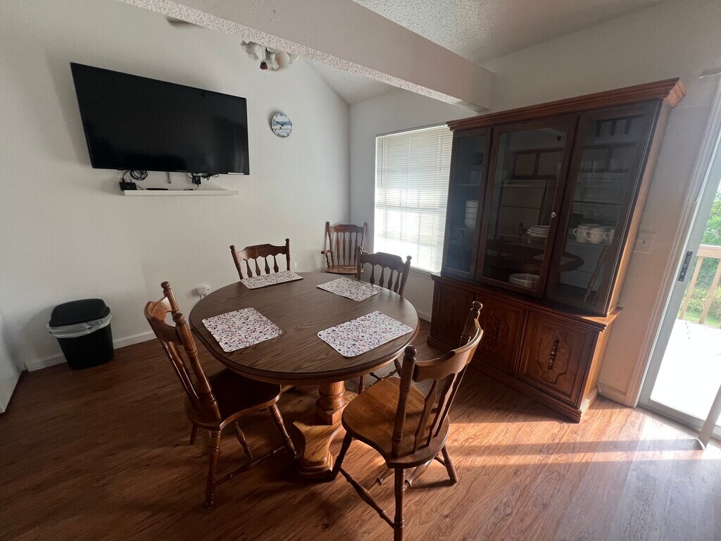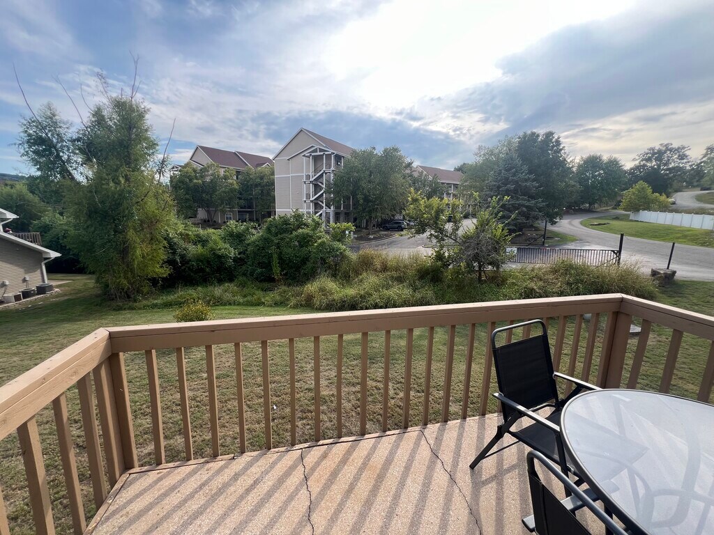 This is a 2 Bath 2 Bedroom Condo that is completely furnished and Refurbished Condo Has 3 wall mounted TV's , dishware, Flatware, cook ware coffee pot . Heat pump for heat and Air and more. There a small deck with a Quite view . Condo is in a Quite part of town and still minuets from all Branson has to offer.