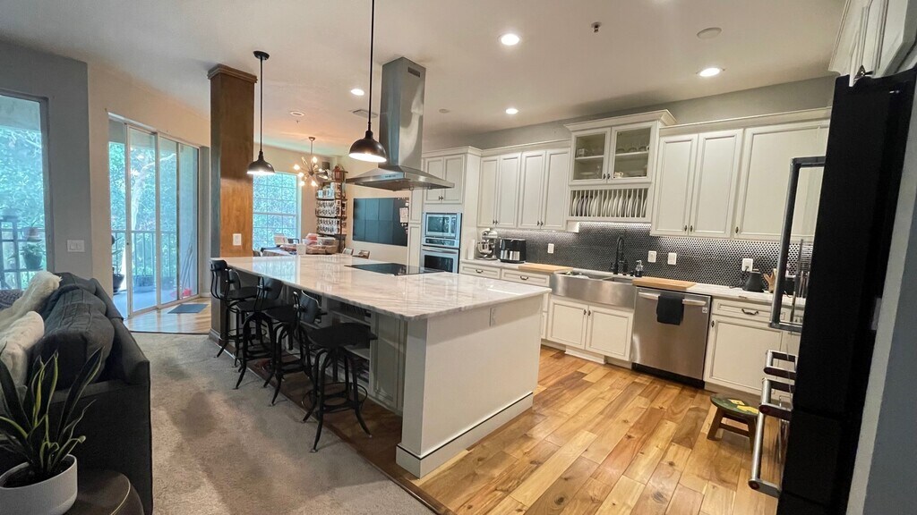 Are you looking for a maintenance-free home in the beautiful Clearwater to fit your needs? Stylishly renovated 1800+ sqft of space, 4 bed/2 baths upper floor privately owned-condo unit in Coachman Reserve. 2nd floor walk-up unit, 1-car garage with long driveway for tandem parking. Gated community with access to pool and gym. Within 10 miles of Clearwater beaches. Target, Walmart, Publix, Sams Club, Costco, Countryside Mall, Starbucks, The Long Center and Gulf-de-Bay restaurants within 5 miles. And best of all, the community is in non-Evacuation zone and no-flood zone areas. Best for young families with school children attending Plato Academy Clearwater (5 min walk), Clearwater High School, Curtis Fundamental and Academie Da Vinci. Or retirees looking for maintenance-free living. Pets are welcome too! - 4 bedrooms / 2 baths, 1863 square feet - Gated community with access to pool and gym - 9-foot-high ceilings throughout, 8-foot doors in bedrooms - Induction range with oven and charcoal vented hood - Washer/Dryer in unit - Wall oven with microwave - 3-tier LG dishwasher - Samsung refrigerator - 15” wine cooler in unit - Dimmable LED light fixtures installed throughout - 9’ x 4’ kitchen island with quartzite countertop - Lots of kitchen cabinet space with pull-away pantry and soft-closing drawers - Farmhouse-style stainless steel kitchen sink with garbage disposal - Screened patio - View of woods from patio - HOA includes Spectrum WIFI and basic cable TV - HOA one-time fees: pet fees; pet security deposit; gate key fobs; pool keys and card