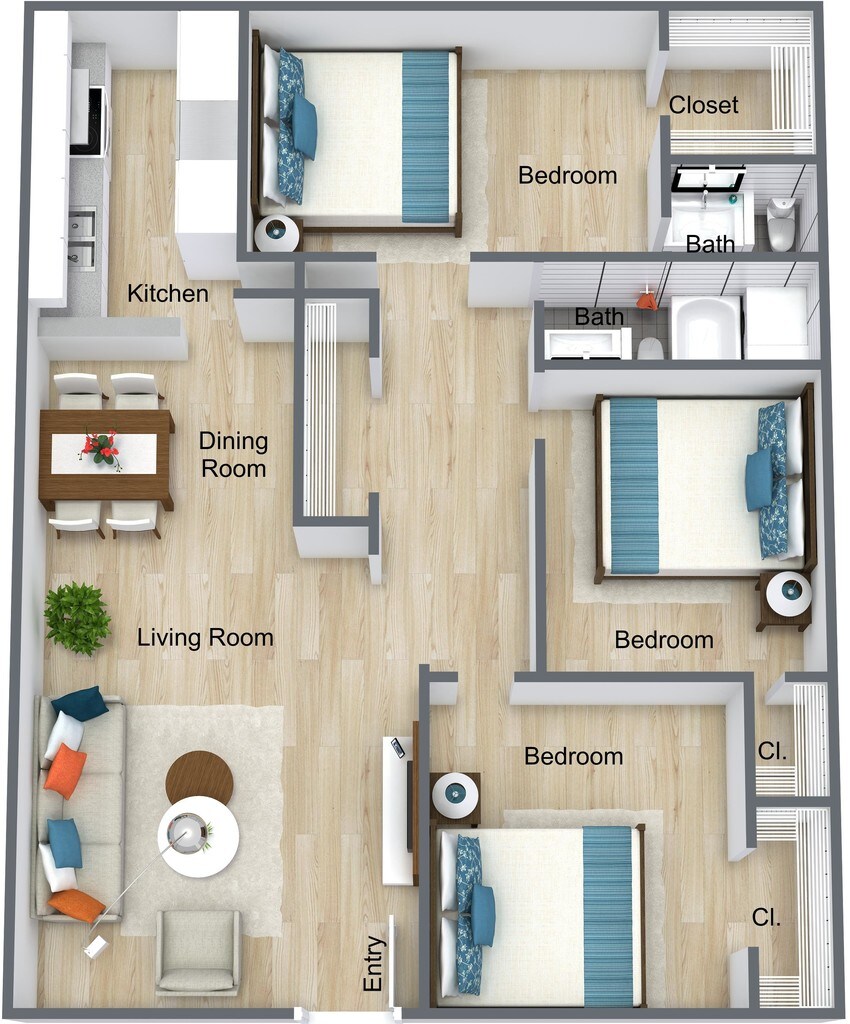 Modelo de apartamento: D (3x2)3 Dormitorios, 2 Baños, 1200 sq ftNo DisponiblePlanosFotos![]()