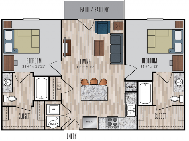 B1 - Plano 1 Unidad de apartamento: PrivateModelo de apartamento: B1$7862 Dormitorios, 2 Baños, 851 sq ftDisponible August 15, 2026Plano: B2