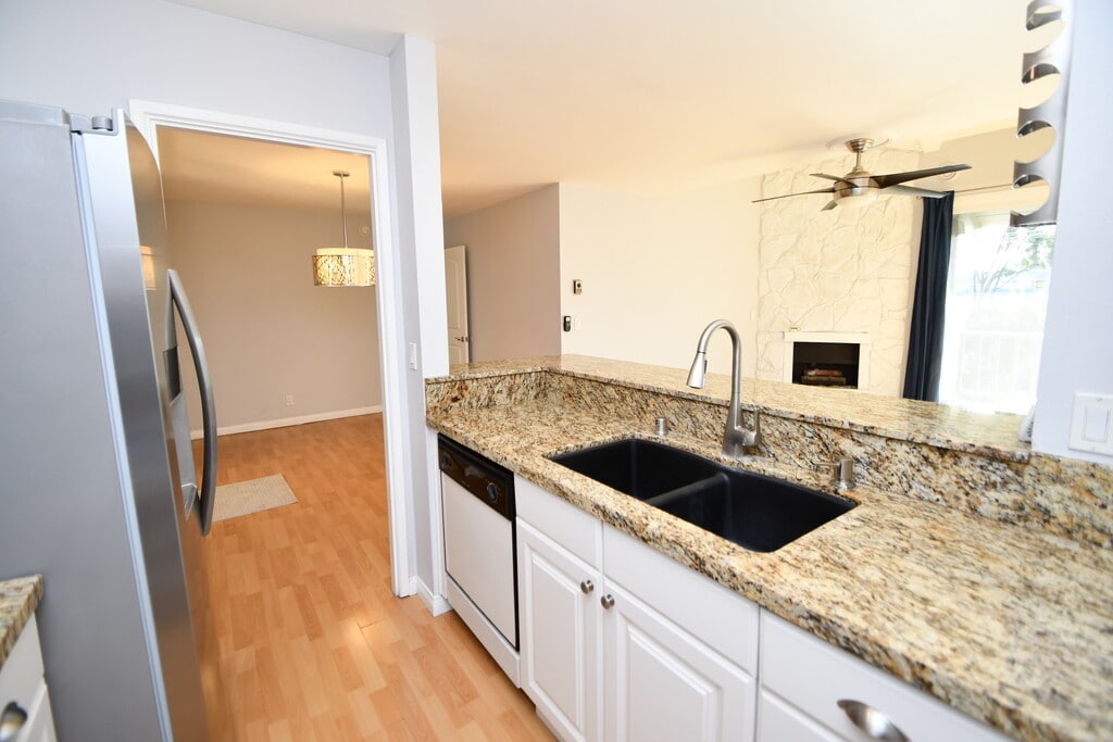 Lovely, updated top-floor unit facing south-southwest awash in natural light. The unit is a 1-bedroom, 1-bathroom in the Del Rey Plaza. There is ample space in living room, along with laminate wood floors, vaulted ceilings, a cozy gas fireplace, and sliding glass doors that open onto a private balcony. The updated kitchen includes granite countertops, stainless steel appliances, ample cabinetry, a breakfast bar, and adjacent dining area with extra storage. The large bedroom also has high ceilings, ample closet space and brand new low-pile carpeting. The unit comes with one assigned parking space in the gated community garage. Building amenities include an elevator, a pool and a community laundry room on every floor. Water, gas, and trash removal are included. The unit is conveniently located near to just about everything. Several major freeways are nearby!
