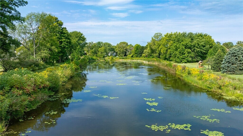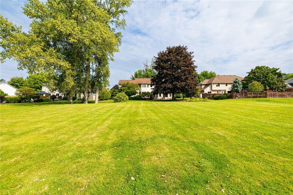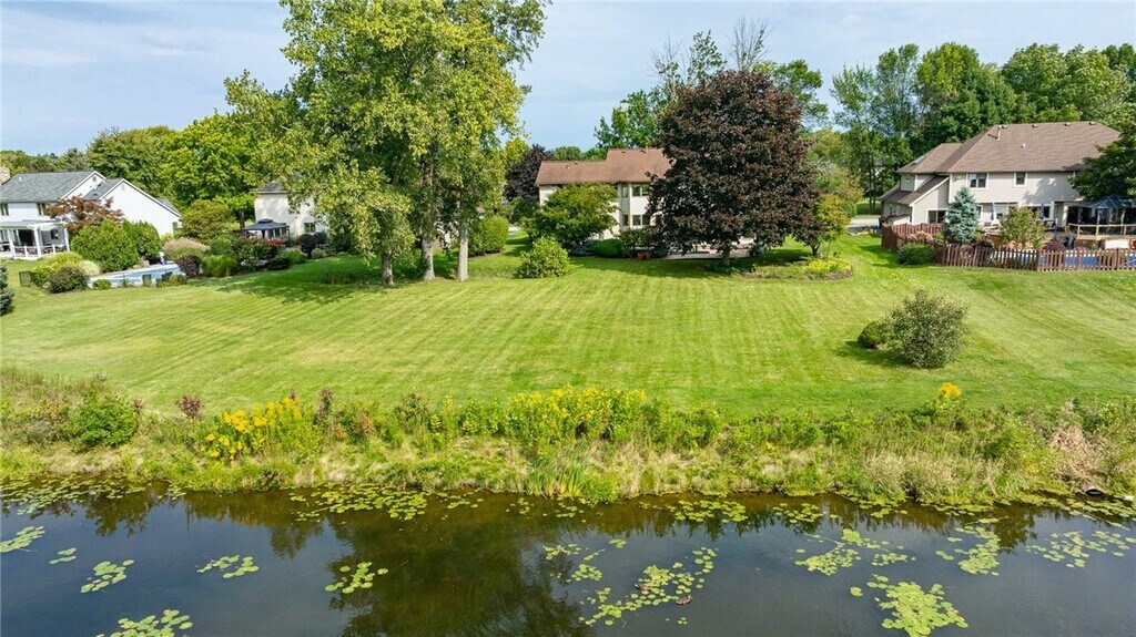 Welcome to this Penfield house – A beautifully crafted Pride Mark Colonial offering over 3,400 square feet of living space. Freshly painted in soothing Swiss Coffee neutral tones, this home boasts updated black modern lighting both inside and out, along with brand-new stainless steel appliances. This rare 5-bedroom home in Glenbrook provides ample room for your family to grow. Key features include: 3 Full Bathrooms First Floor Laundry 2-Car Attached Garage Finished Basement As you enter, you're greeted by a two-story foyer with a stunning new black wagon wheel chandelier. The formal dining room, featuring chair rail and a contemporary matte black and gold geometric pendant light, offers an elegant touch. The oversized kitchen overlooks the picturesque back ponds and includes granite countertops, stainless steel appliances, and cherry cabinetry. The front and back living rooms and family rooms are separated by pocket doors and include a cozy wood-burning fireplace. A bonus fifth bedroom, with an adjacent full bathroom, offers potential for an in-law suite. Upstairs, you’ll find an expansive primary bedroom, complete with a luxurious en suite featuring a two-person soaker tub, granite counters with a powder area, and multiple closets. The additional main bathroom offers dual vanities with granite countertops and an updated shower. The partially finished basement, with new carpeting, adds over 700 square feet of additional living space – ideal for a man cave or bonus area. In the warmer months, enjoy your four-season room leading to a deck and patio that overlooks serene ponds, stocked with fish and perfect for ice skating in the winter. This home is ideally located directly across from Plank Road South Schools, parks, and is just moments from Wegmans, shops, and Irondequoit Bay.