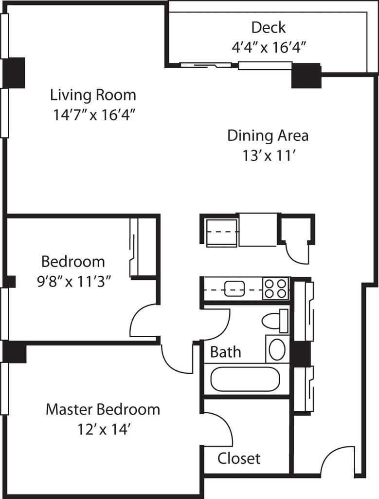 Modelo de apartamento: 1ELlame para Precios1 Dormitorio, 1 Baño, 625 sq ftNo Disponible![]()