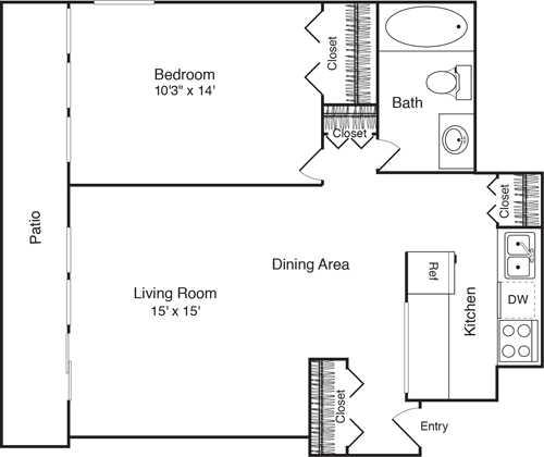 Modelo de apartamento: Plan 31 with PatioLlame para Precios1 Dormitorio, 1 Baño, 502 sq ftNo Disponible![]()