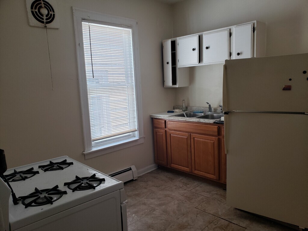 Dos habitaciones, un baño, apartamento; 2nd piso de la parte posterior; incluye estufa a gas; el inquilino paga los servicios públicos; no fumadores, no se admiten mascotas, de antecedentes y de crédito (600 minutos); sin desalojos; solicitud en línea, verificación de empleo (3 veces alquiler); cerca del transporte público.