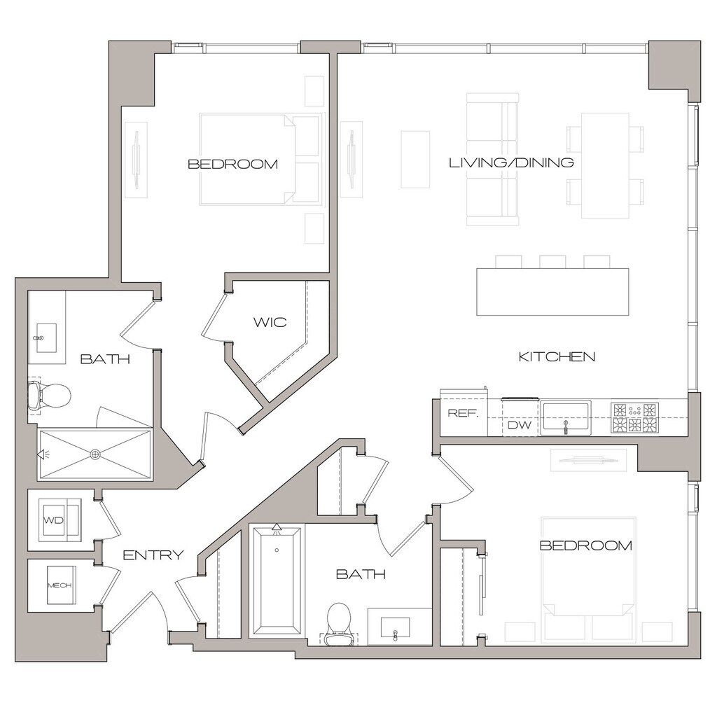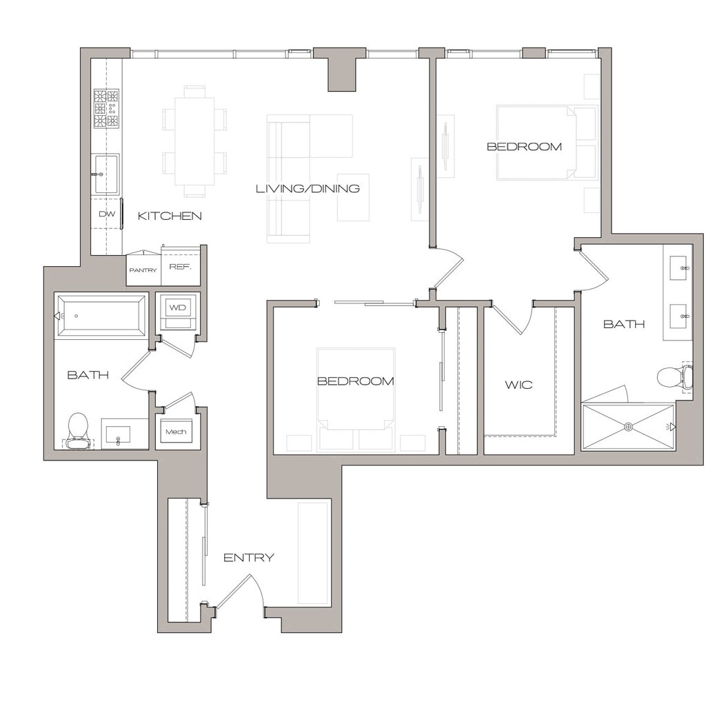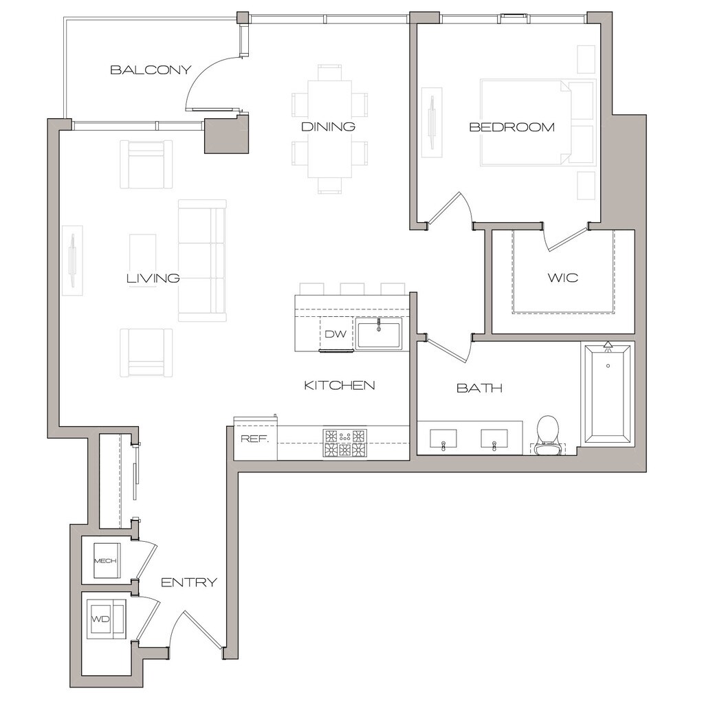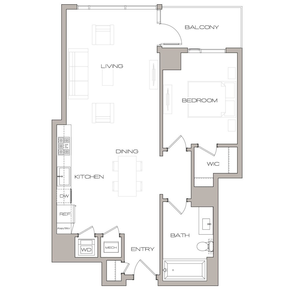 1 Dormitorio, 1 Baño, 743 pies²Disponible AhoraGalería del Modelo