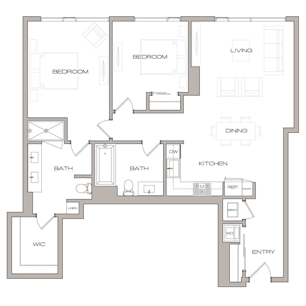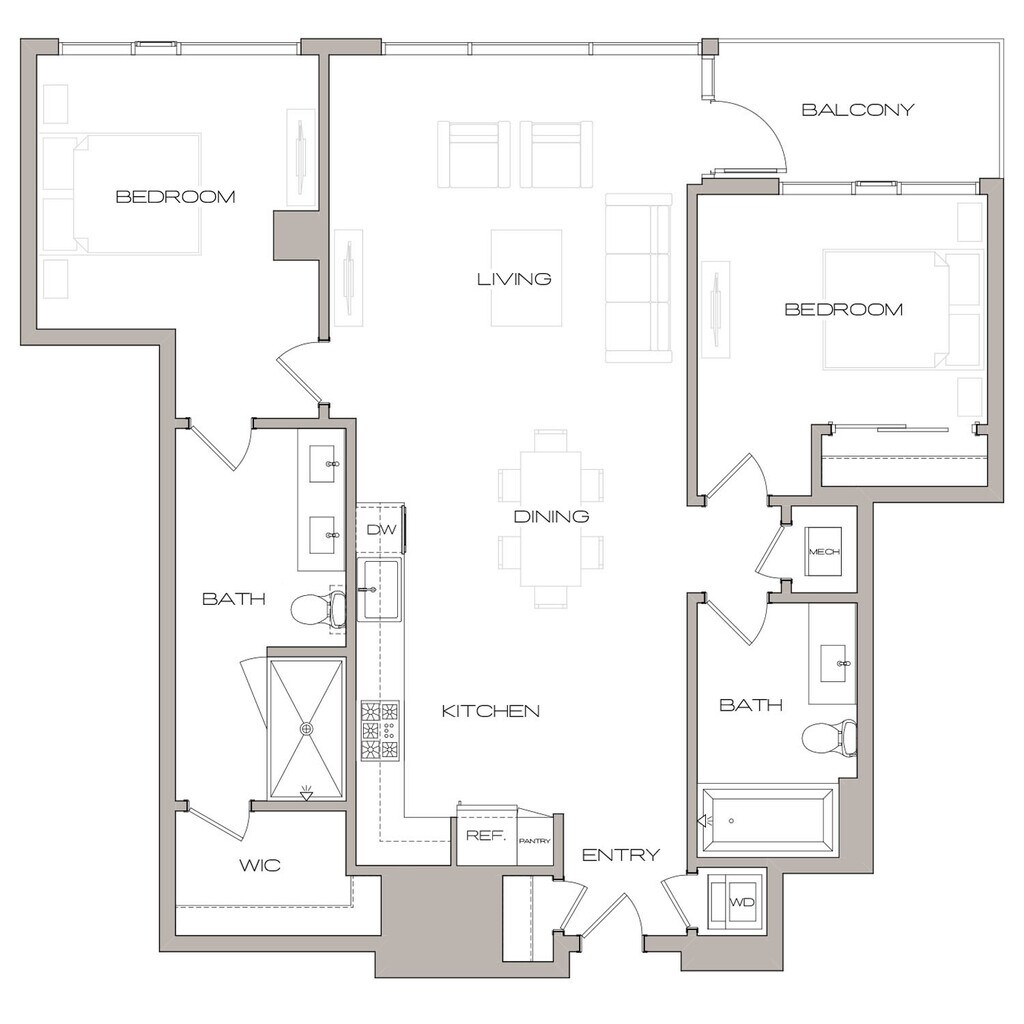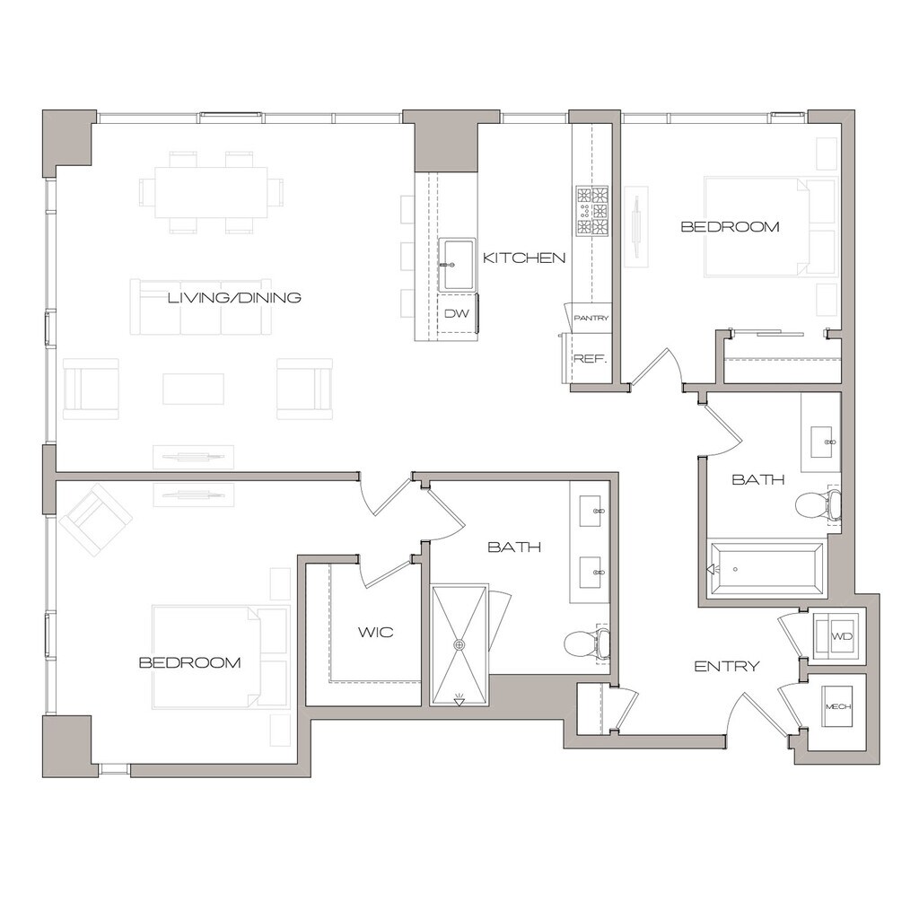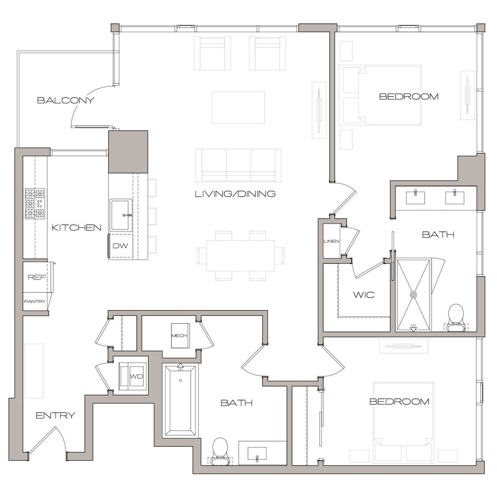 1 Dormitorio, 1 Baño, 743 pies²Disponible AhoraGalería del Modelo