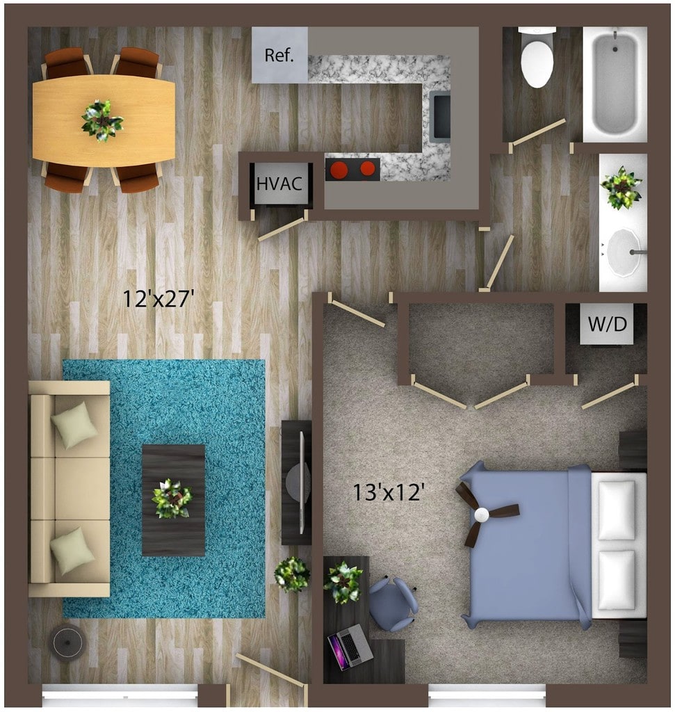 1 Dormitorio, 1 Baño, 728 pies²Galería del Modelo
