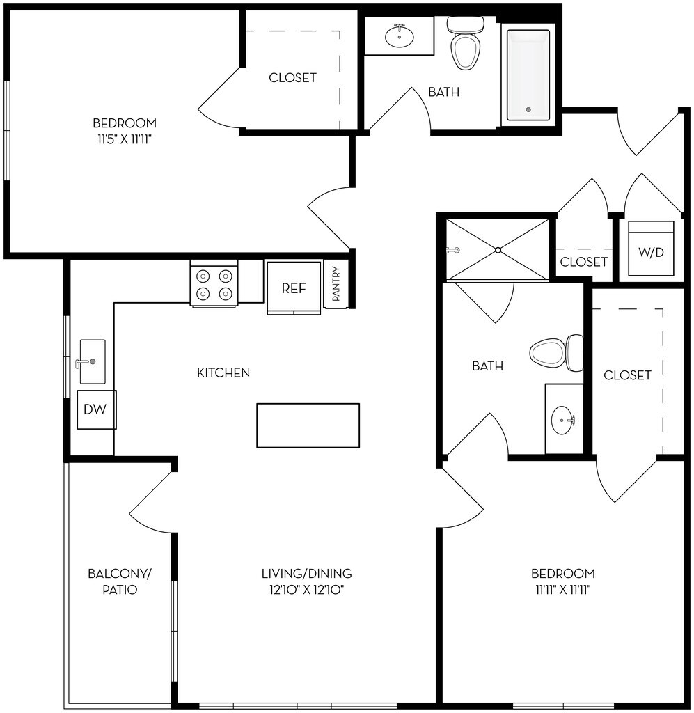 B4 - Plano 1 Unidad de apartamento: 209Modelo de apartamento: B4$3,8482 Dormitorios, 2 Baños, 1001 sq ftDisponible AhoraPlano: B1