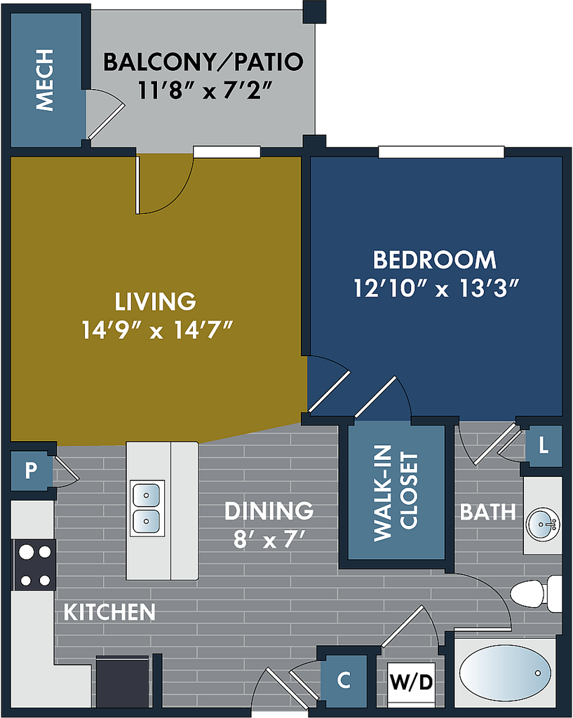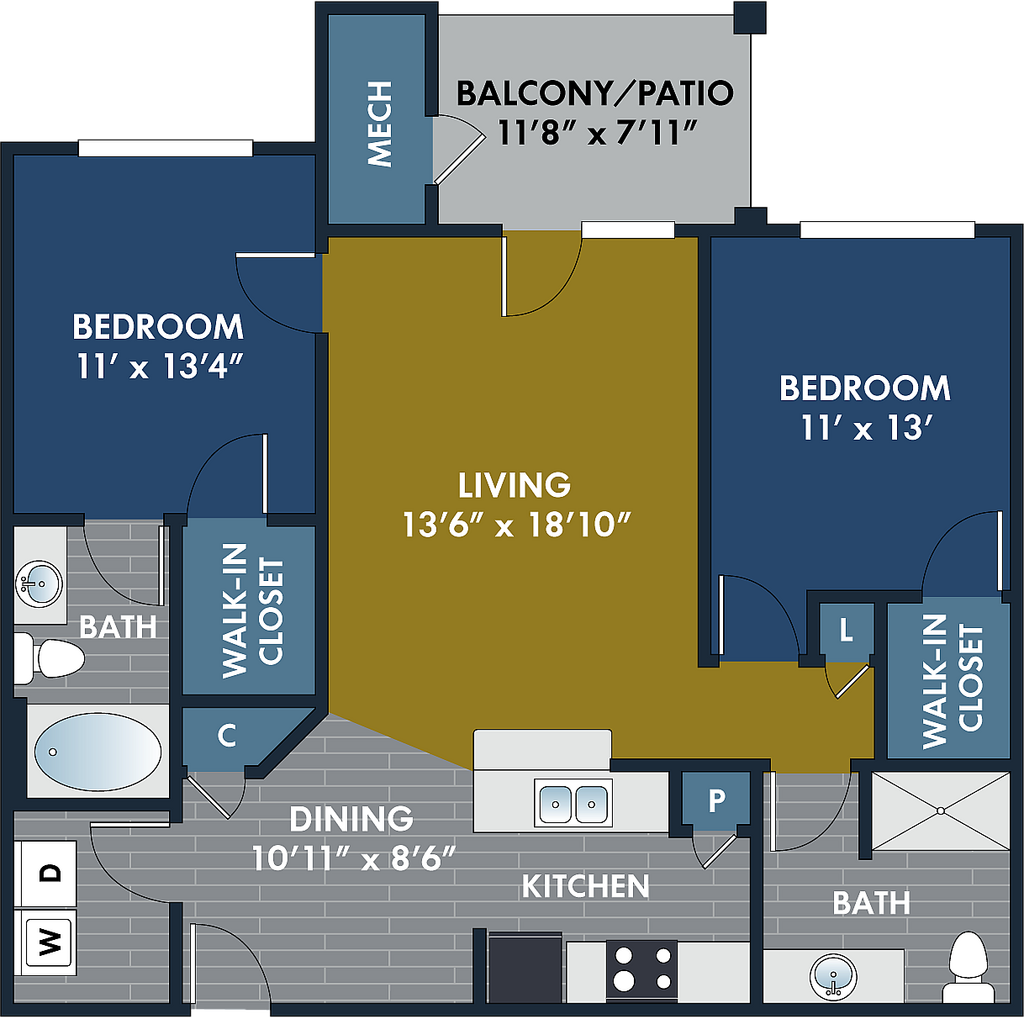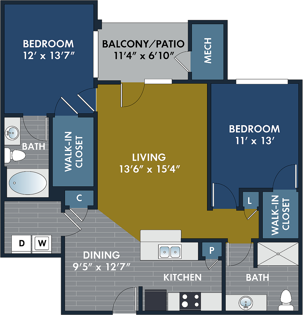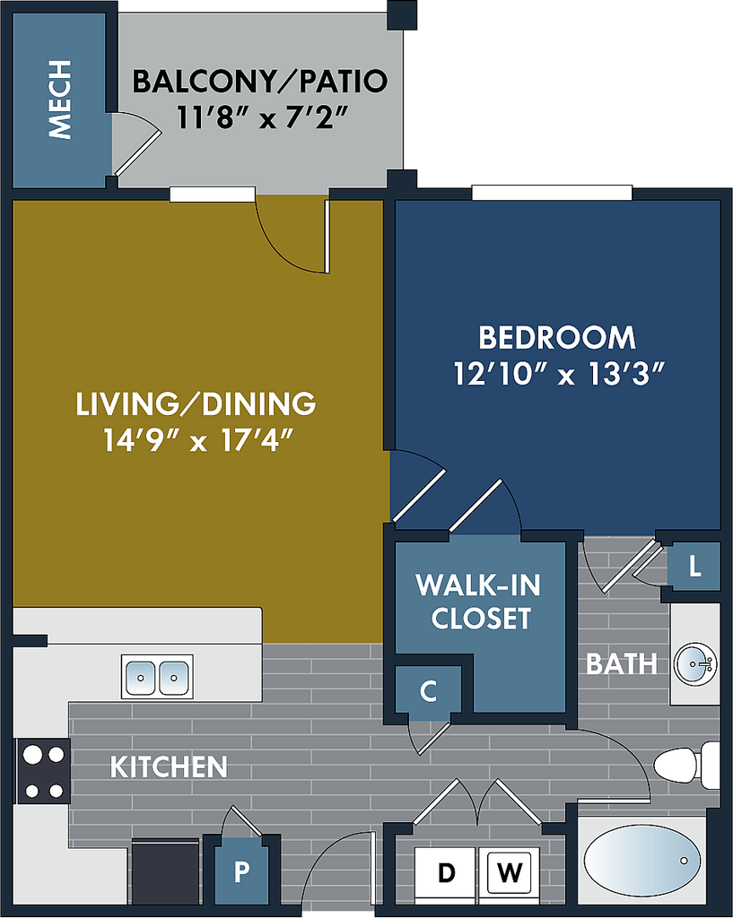 Modelo de apartamento: BarrettDesde $1,4641 Dormitorio, 1 Baño, 694 sq ftDisponible Ahora![]()