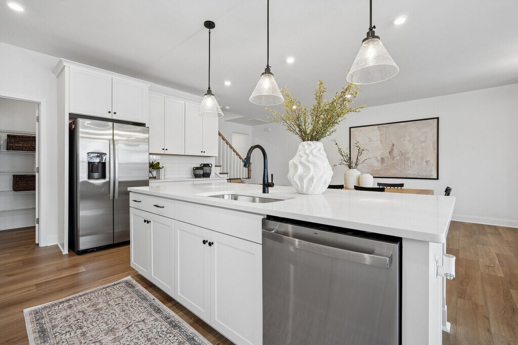 - Gabinetes blancos y protector contra salpicaduras de azulejos tipo metro